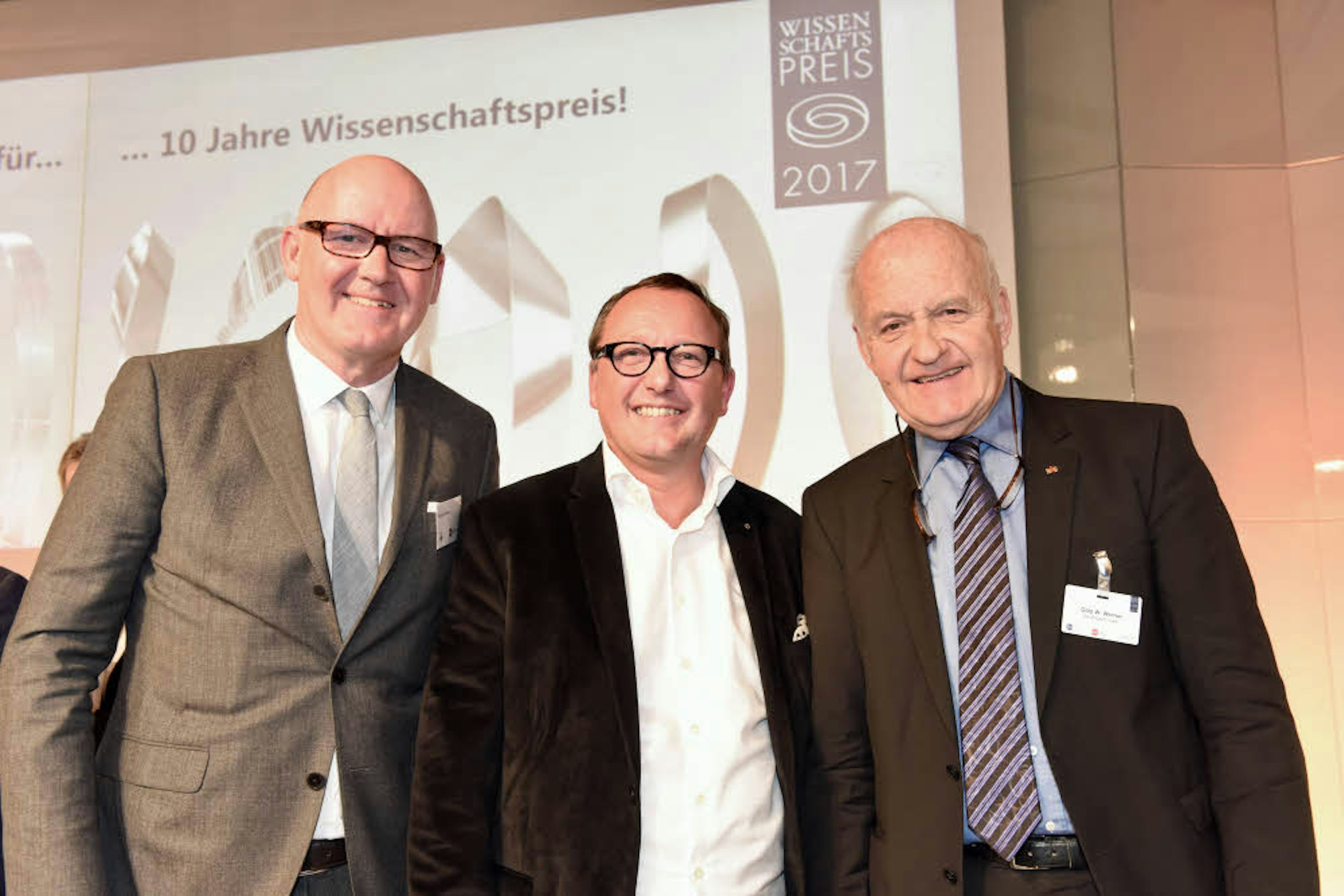 Beim Wissenschaftspreis 2017 steht Karl-Heinz Land neben Götz Werner, Gründer der Drogeriemarkt-Kette dm.