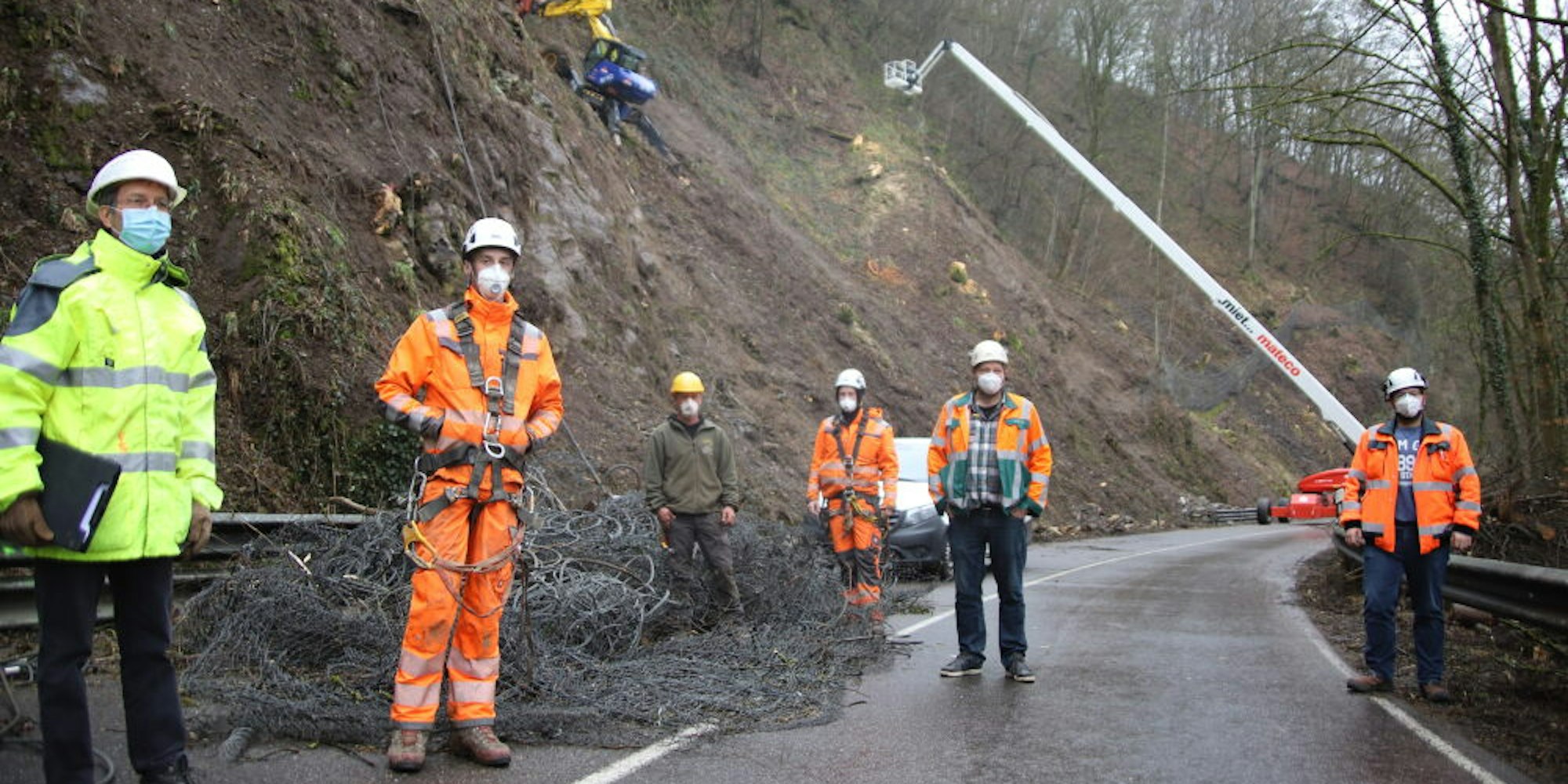 Zunächst wird eine Randumfassung aus Stahlseilen gesetzt, anschließend kommen speziell in der Schweiz gefertigte Platten auf die versenkten Anker, durch die später das Stahlnetz wie ein Vorhang von oben herabgelassen wird, wie Westphal erklärte. Sein Kollege Adrian Kappes macht die Bauüberwachung des aufwendigen Projekts zur Sicherheit der Autofahrer.