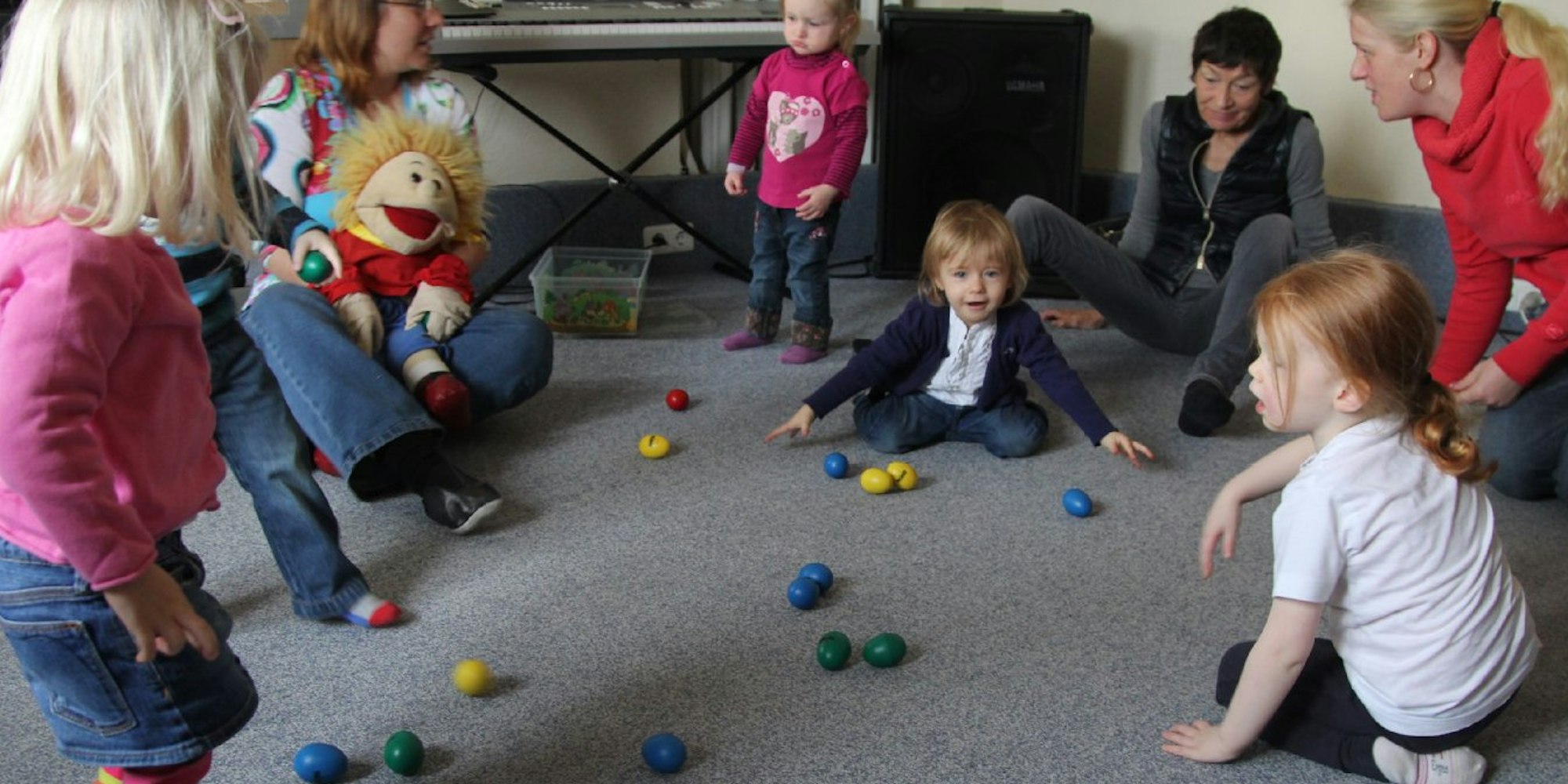 „Toni im Liedergarten“ – musikalische Früherziehung mit Petra Reinhardt (3.v.l.) und ihrer bunten Puppe.