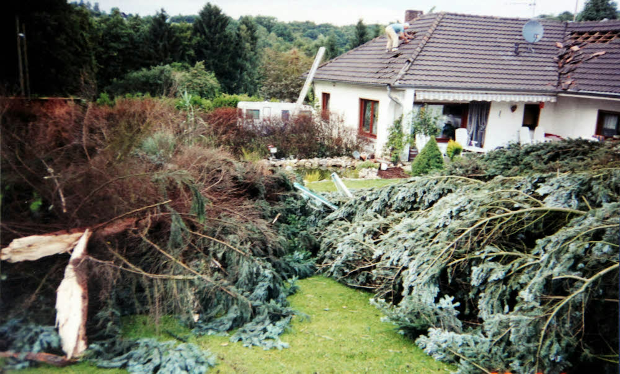 „Hier war alles zu, hier konnte keiner mehr durchfahren“, berichtet Behner. 25 Meter hohe Tannen waren der Windhose zum Opfer gefallen. Ein 80 Kilo schweres Zinkfass wurde später 200 Meter entfernt gefunden. „Ich war im Haus, da sah ich plötzlich den Baum liegen“, erinnert sich Aldas Tante Anneliese Alda (80). Gemeint ist die Tanne, die seit mindestens 50 Jahren am Rand des Grundstücks an der Königswinterer Straße (L 268) gestanden hatte. Vier Meter über dem Boden war der Stamm von der Windhose abgedreht worden. Der Baum muss regelrecht hochgewirbelt worden sein. Das Bruchende ragte über die Leitplanke auf der gegenüberliegenden Straßenseite, während die Tannenspitze das Garagentor der Aldas berührte.