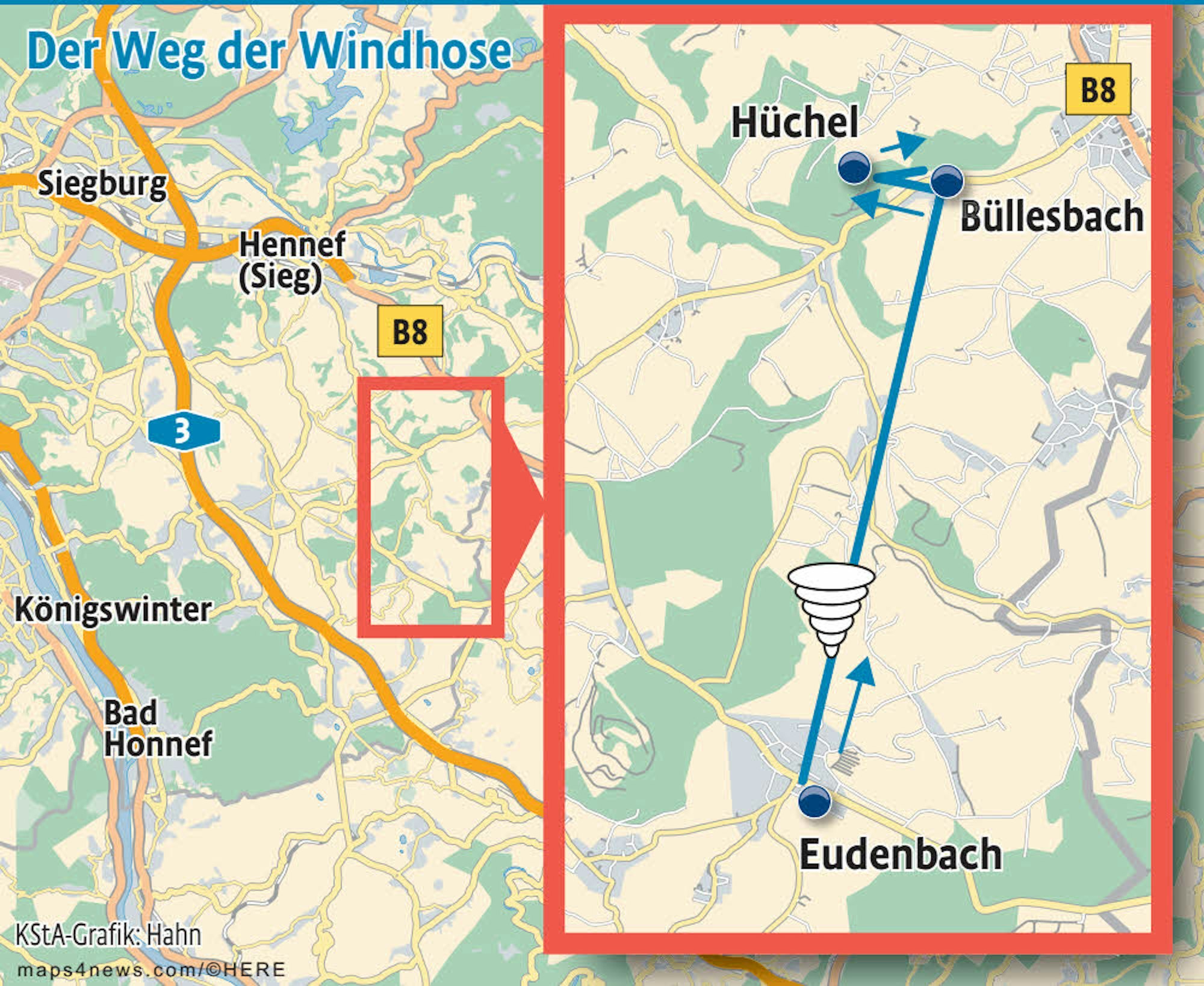Zu der Windhose weiß Markus Alda noch zu erzählen, dass diese bei Eudenbach entstanden ist. Das habe ihm ein Kollege berichtet, der dem Wirbel auch nachgefahren sei und damals seinen Chef benachrichtigt habe. „Da am Pflaumenbaum vorbei ist sie heruntergekommen“, erklärt Alda und zeigt in den Hang hinter dem Haus. Dann sei die Windhose weiter in Richtung Hüchel gezogen, kurz vor Hüchel stehengeblieben und wieder zurückgekommen. In Twister-City löste sie sich auf.