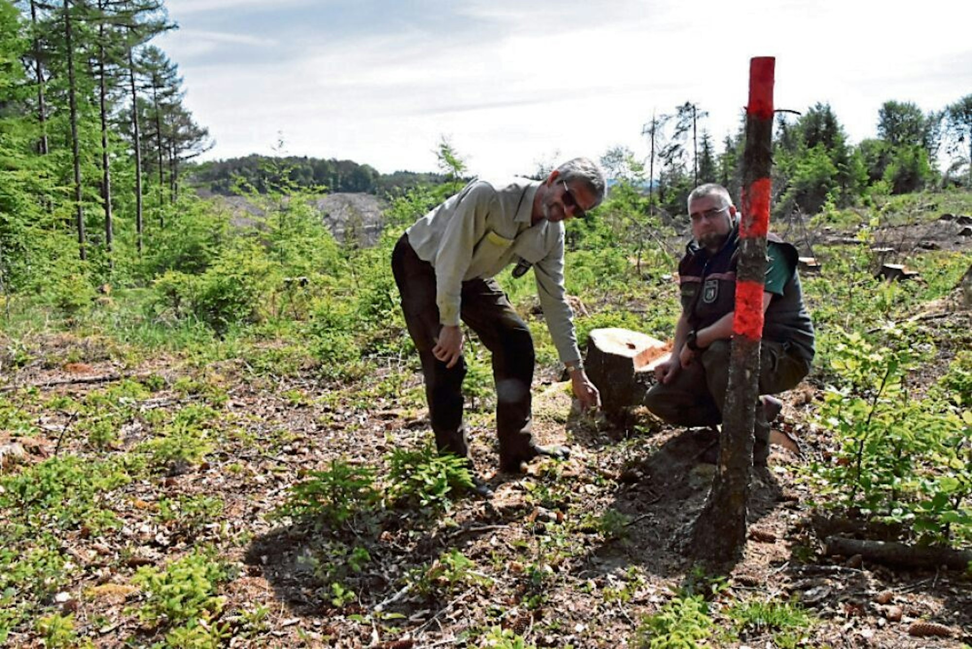 Für die Zukunft setzen die Förster auf eine Mischung. Unter anderem sind Lärche, Eiche, Kiefer, Eberesche, Aspe, Weide und Birke im Sortiment. Ganz auf die Fichte wollen und können sie nicht verzichten. Dass schon Kochs Vorgänger Karl Hoberg in den vergangenen 25 Jahren unter den Fichten mindestens 100 000 Buchen anpflanzen ließ, zahle sich auf einigen Flächen jetzt aus, berichtet Schölmerich.