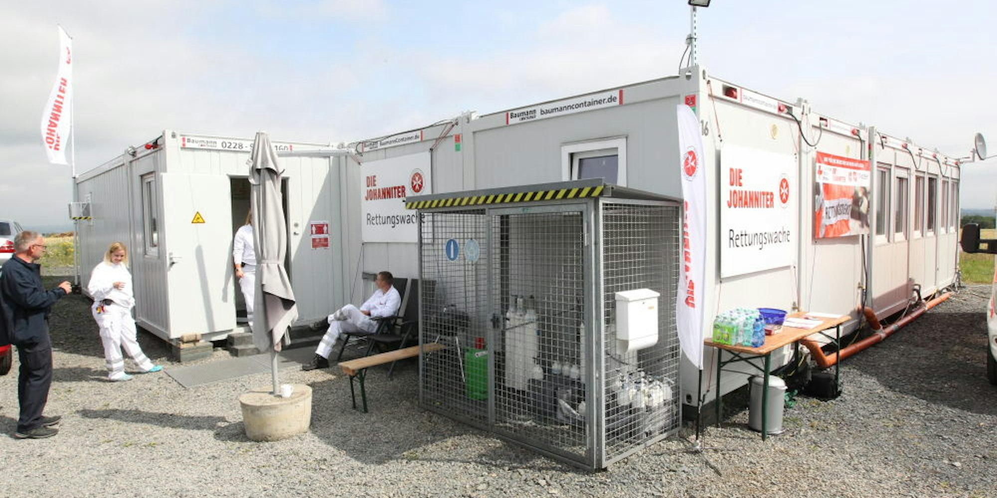 Die Anschlüsse für Strom und Wasser waren noch von den Flüchtlingscontainern vorhanden, so dass die Johanniter reibungslos ihren Dienst aufnehmen konnten. Und anfängliche Bedenken der Anwohner scheinen auch verflogen zu sein. „Wir haben alle Bewohner der Straße frühzeitig informiert und es gab auch schon Kuchen für uns“, sagt Marquardt und blickt in die Ferne: „Wer hat schon bei der Arbeit so eine tolle Aussicht?“