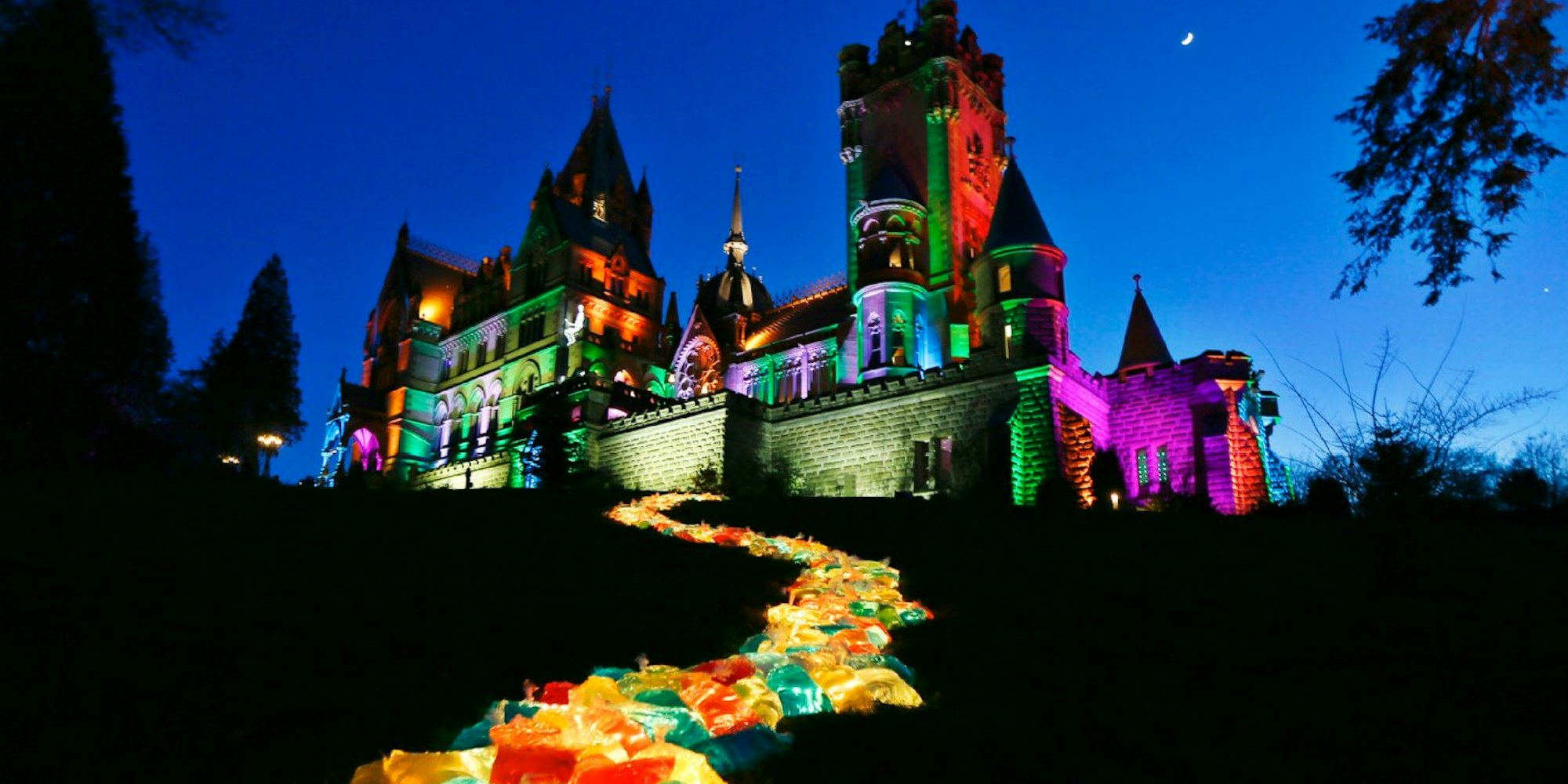 Lichtinstallation Wolfgang FlammersfeldSchloss Drachenburg in bunte Farben getaucht