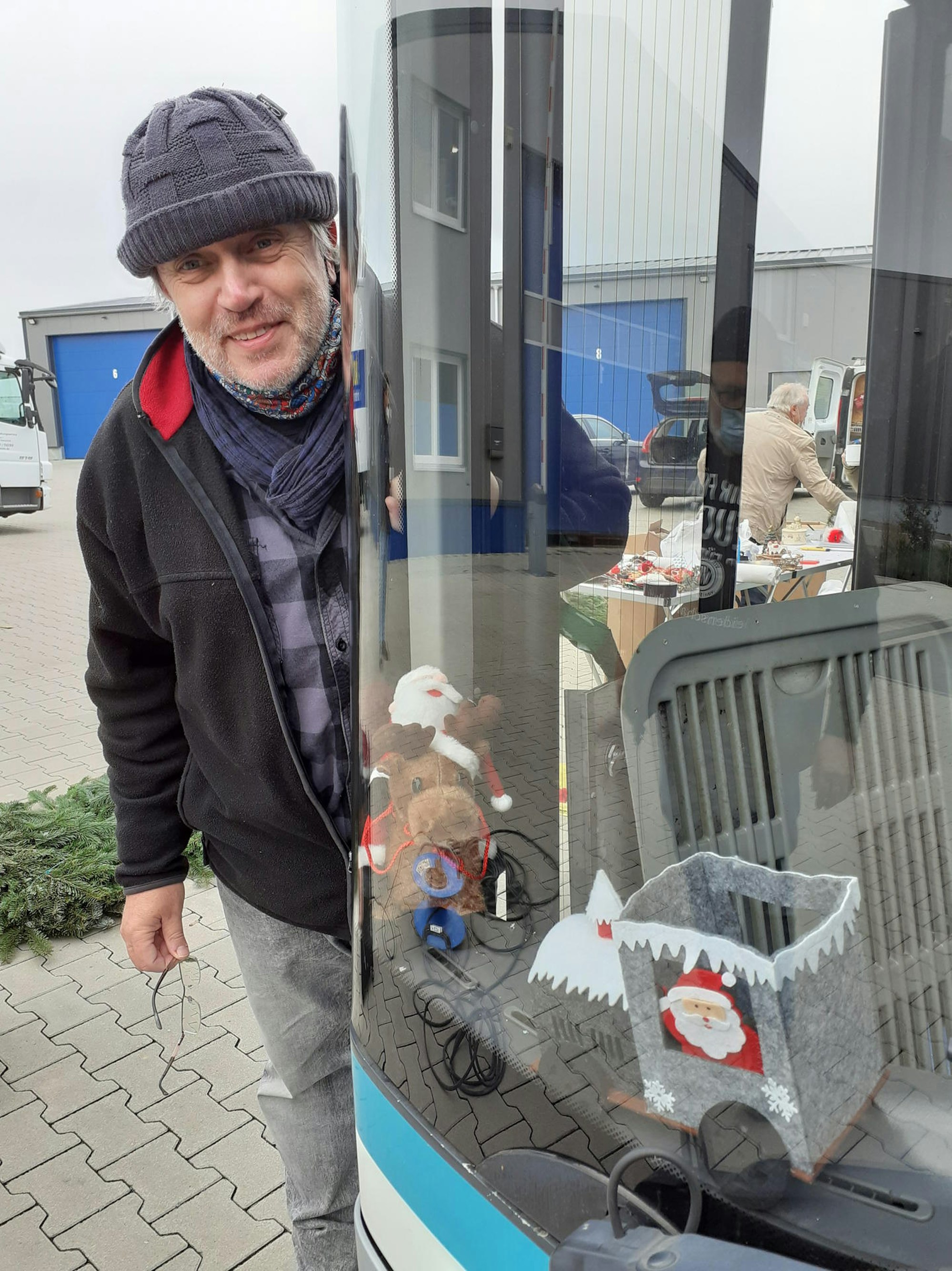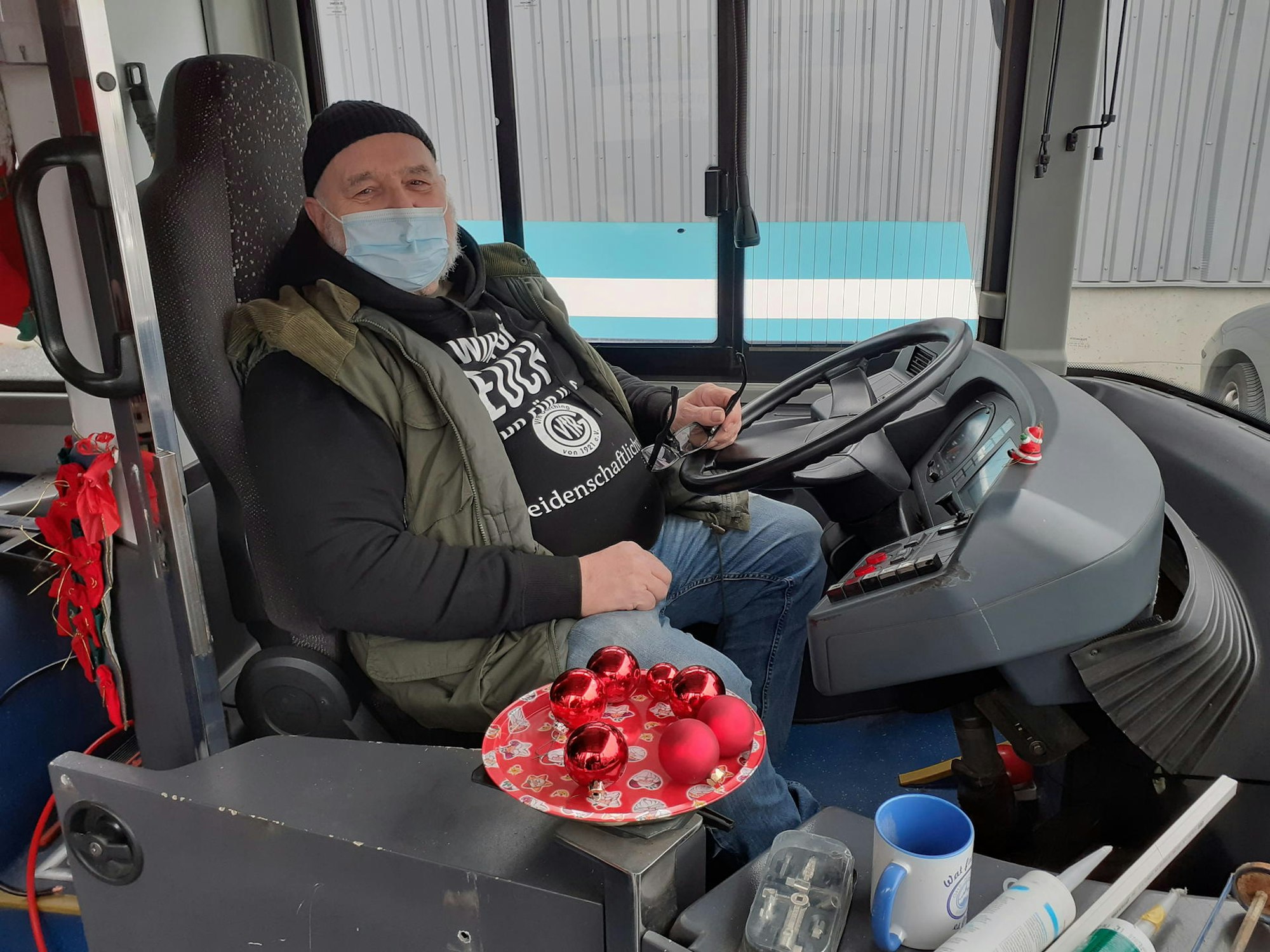 An diesem Samstag schaut auch Theo Heck vorbei, der den Start gar nicht erwarten kann. Ansonsten auf sämtlichen Advents- und Weihnachtsmärkten ringsum als Nikolaus unterwegs, ist sein wachsender Rauschebart jetzt unter dem Mund-Nasen-Schutz versteckt. Der 70-jährige Unruheständler, der noch als Fahrdienstleiter für den Hennefer Omnibusbetrieb Brenner arbeitet, hat das 25 Jahre alte Fahrzeug der Marke Solaris besorgt.