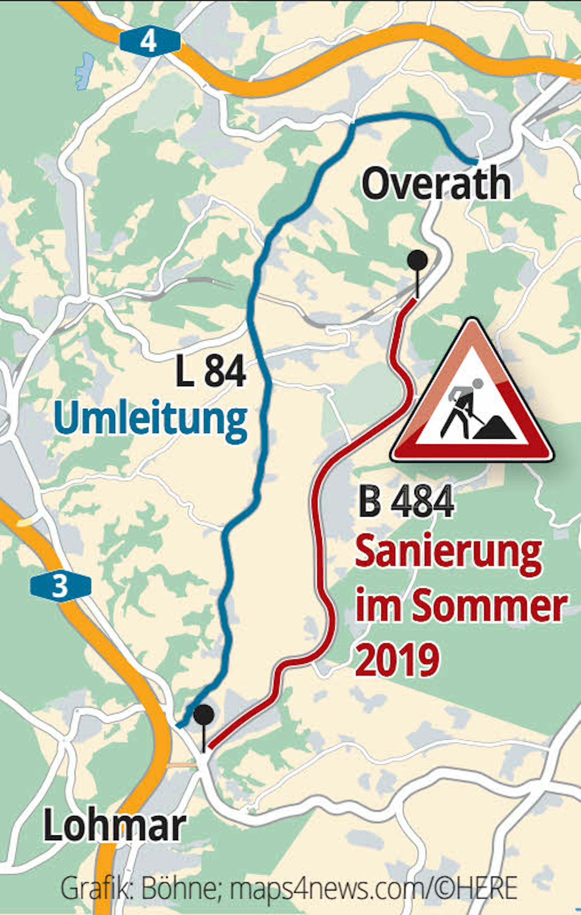Lohmar/Overath – Autofahrer müssen sich im Aggertal auf Verkehrsbehinderungen, Sperrungen und längere Fahrzeiten einstellen: In den Sommerferien saniert der Landesbetrieb Straßen NRW einen Abschnitt der Bundesstraße 484. Das teilte die Behörde mit. Der Durchgangsverkehr wird schon ab Donrath umgeleitet. Anlieger können die Straße allerdings bis zur Baustelle befahren.