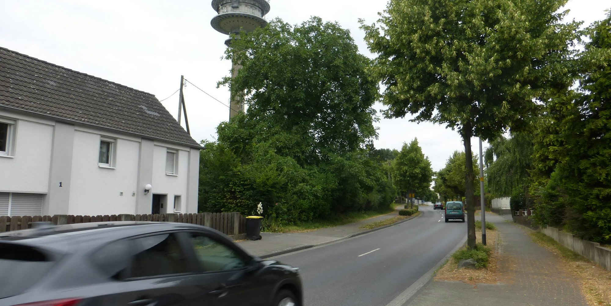 Nahe am weit bekannten Birker Fernmeldeturm soll links der Bundesstraße 56 , wo die grünen Büsche mit dem Baum stehen (Bildmitte), ein Autohaus gebaut werden.