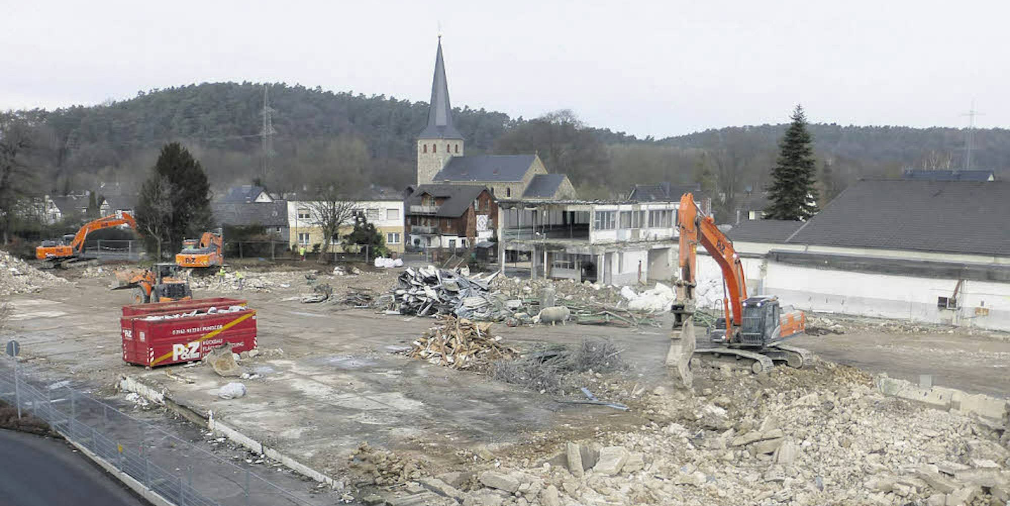 Derzeit kann man sich sehr gut ein Bild machen von der Größe der Fläche. Der Abriss des über die Jahrzehnte dort mit Anbauten verschachtelt errichteten Kümpel-Hallenkomplexes ist fast abgeschlossen und gibt damit den Blick frei.