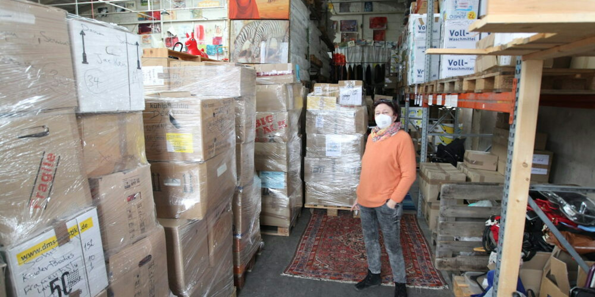 Gepackte Paletten im Lager in Troisdorf am Gierlichsstraße: Manu Gardewig zeigt die vorbereiteten Spenden-Kartons.