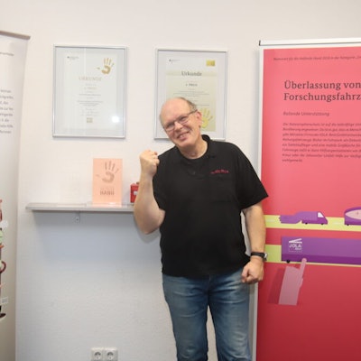 Peter Hoffmann von Jola Soft- und Hardware erklärt das System der Chips, die bei Unterschreitung eines Mindestabstands in Magenta statt Weiß blinken.