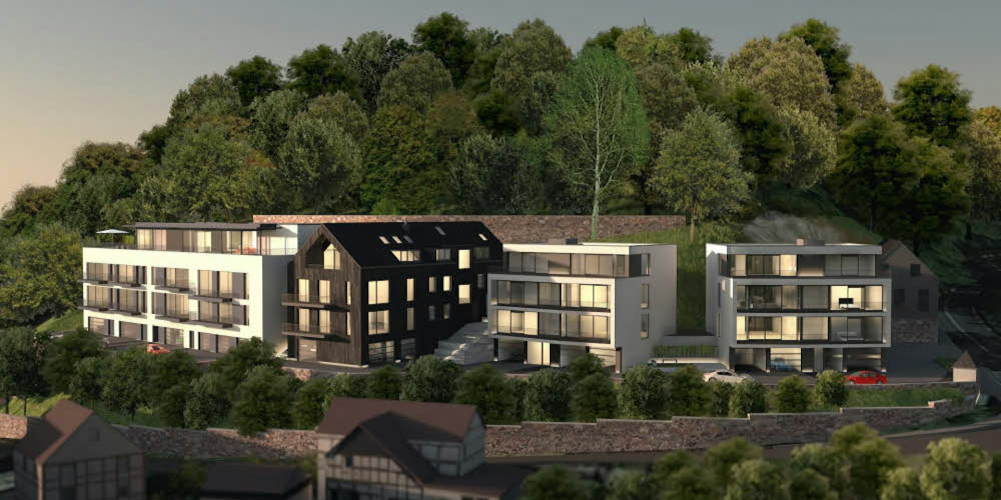 Diese Planung soll frischen Wind nach Kreuznaaf bringen. Die Visualisierung zeigt, dass der langgestreckte Bau und das Giebelhaus erhalten bleiben, Die beiden rechten Objekte entstehen komplett neu.