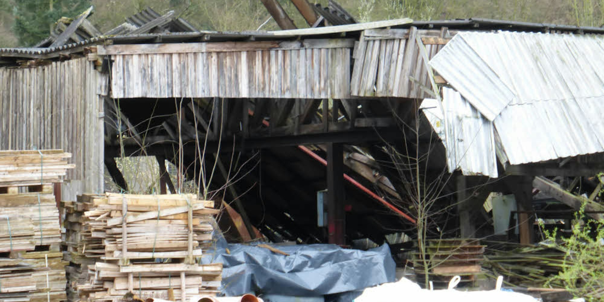 Mitten in dem Areal befindet sich die Brache des stillgelegten Sägewerks, in dem es 2009 brannte. Der erbärmliche Zustand dieses Grundstücks stört die Stadtvertreter und Politiker genauso wie die Donrather Bürger. Dass hier dringend etwas geschehen muss, machte spätestens der Einsturz des Daches Anfang März deutlich. Die dort gelagerten Fässer mit Altlasten konnte der Kreis als Aufsichtsbehörde bisher noch nicht untersuchen.