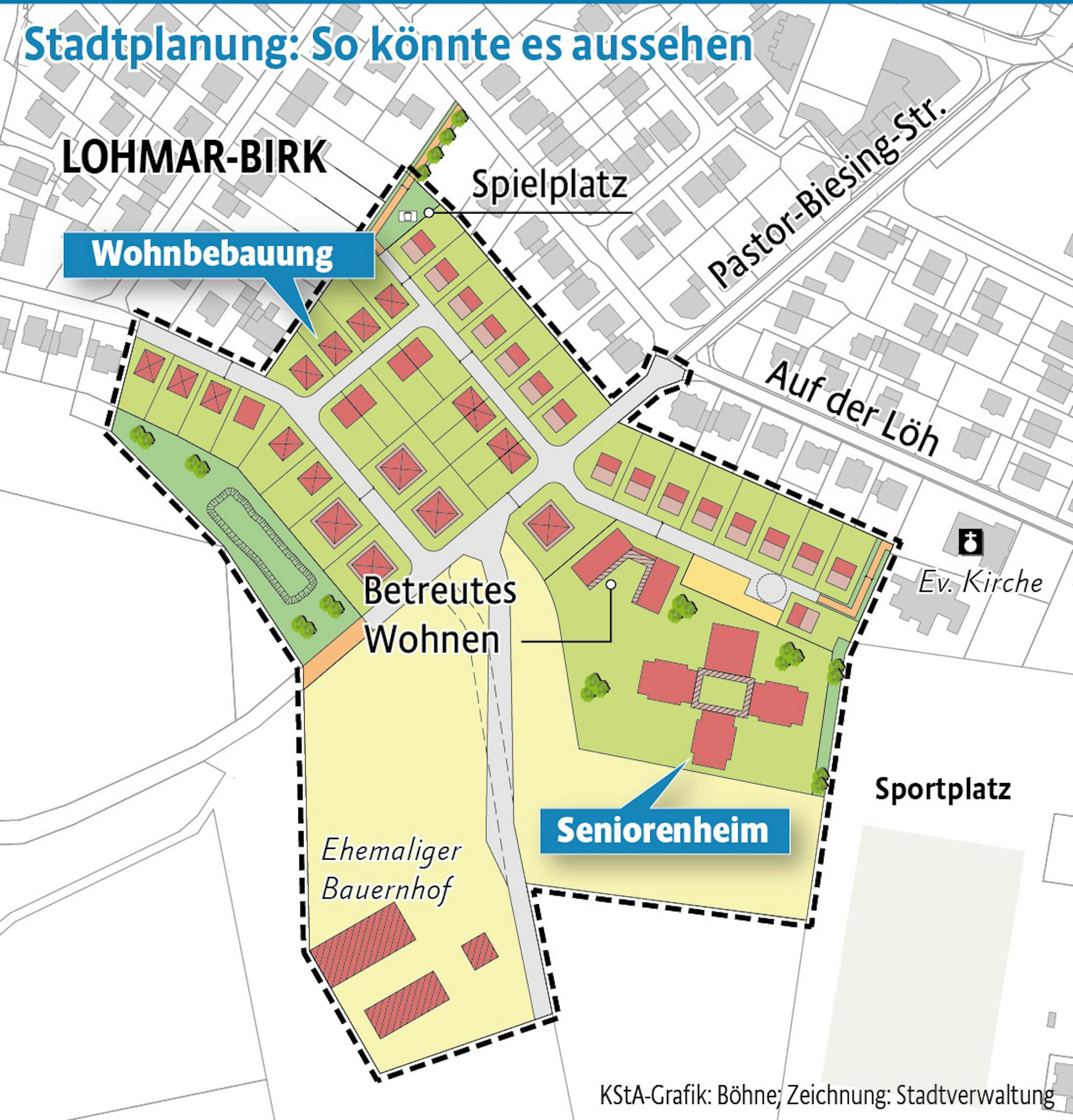 Im Brennpunkt stand vielmehr eine Wohnbebauung, ebenfalls auf noch grüner Wiese am südöstlichen Birker Ortsrand. Nachgedacht wird bisher über 148 Wohneinheiten, davon 80 in einem Pflegewohnheim sowie 20 in einem Bau für betreutes Wohnen.