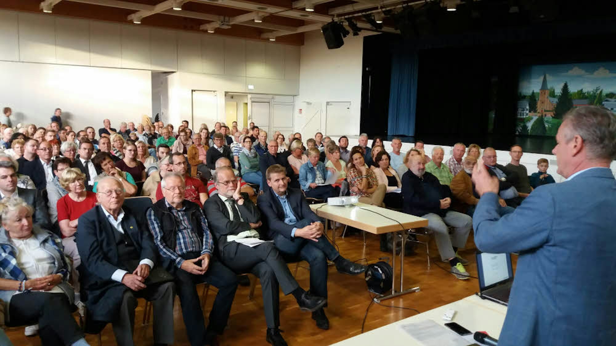 Hier könnte doch besser eine neue Grundschule gebaut werden, und auf dem derzeitigen Schulgelände neben der katholischen Kirche und dem Bürgerhaus dann ein Seniorenheim, regte Anwohner Burkhard Bröhl an, der für eine etwa 40-köpfige Gruppe von Bürgern sprach. Diese hatten sich im Vorfeld zusammengesetzt und ihre Überlegungen in vier Anträge gegossen. Ein Punkt war, dass die geplanten Sozialwohnungen gerecht in der ganzen Stadt verteilt werden sollten. Für Wahlscheid seien nur zwei Mehrfamilienhäuser geplant, für Birk hingegen fünf. „Es gibt Gerüchte, dass hier die Flüchtlinge aus der ganzen Stadt untergebracht werden sollen.“