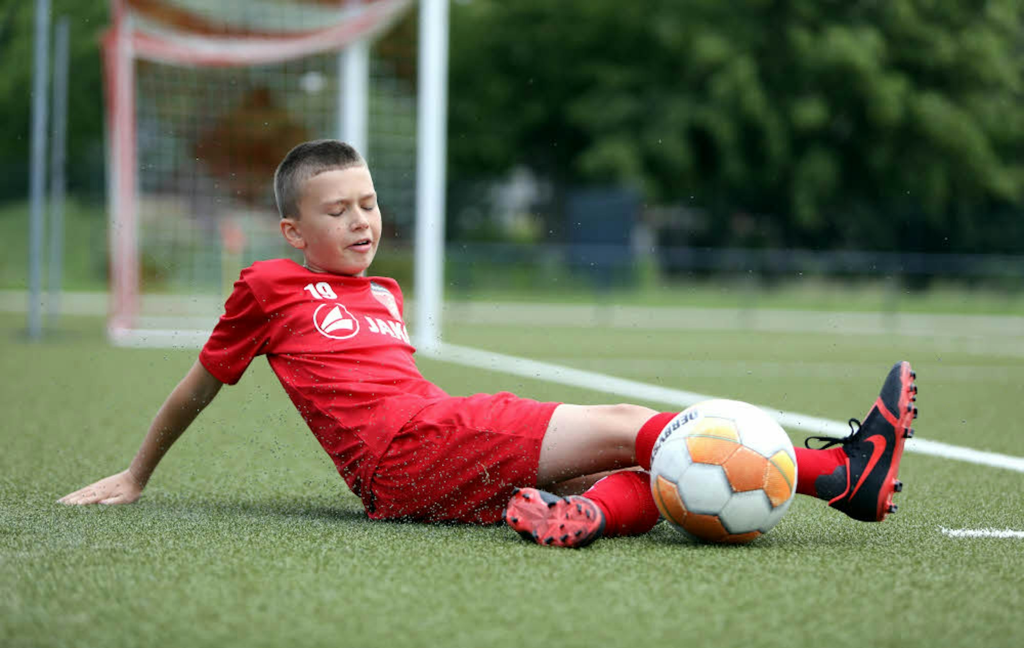 Bei Stürzen, wie hier von Jason Knaus (12) von den Sportfreunden Troisdorf, schützt das Granulat den Spieler vor Schürfwunden.