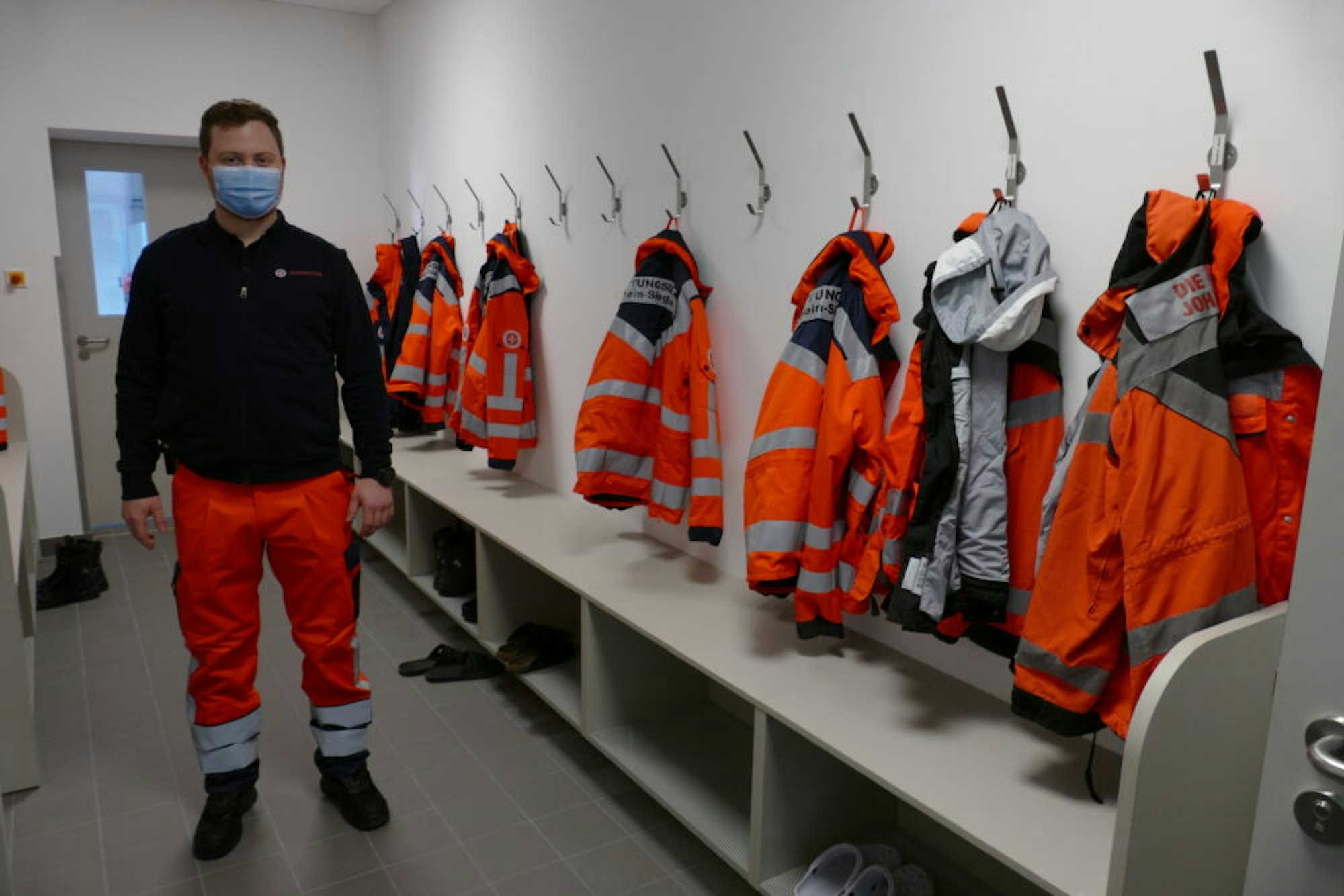 Eine Garderobe verbindet die Fahrzeughalle mit den Bereitschaftsräumen, außerdem gibt es einen Waschraum für Material und Kleidung. „Drinnen sollen die Leute dann auch Hausschuhe tragen“, so Müller. An die drei Hallen schließt eine Waschanlage an. „Hier hat sich der Kreis nicht lumpen lassen, es gibt sogar eine Leiter, um das Dach zu waschen – die Geräte sind vom Allerfeinsten“, freut sich der Rettungsdienstmitarbeiter. „Wir sind sehr glücklich, aus den Containern raus zu sein, denn dort befand sich alles auf engstem Raum.“