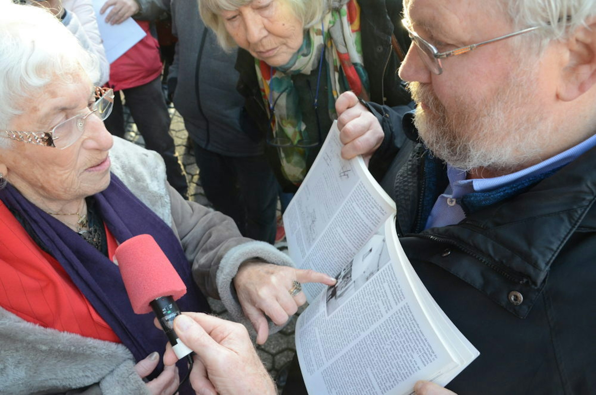 „Im Telefonbuch“ habe er sie gefunden, erzählte Georg Langen vor dem Gebäude der Kreissparkasse, das heute am Platz des kleinen Hauses steht. Als Lehrer am Kopernikus-Gymnasium forscht er seit Jahren mit seinen Schülern zu den Jahren des Terrors in Niederkassel. „Verschreckt“ habe Karola Adami damals auf seinen Anruf reagiert, für eine Ausstellung im Rathaus schützte sie sich mit dem Namen Elisabeth Schindler. „Es gibt noch Nazis, die stecken dir das Haus an“, sei sie damals gewarnt worden, erzählt die rüstige 94-Jährige.