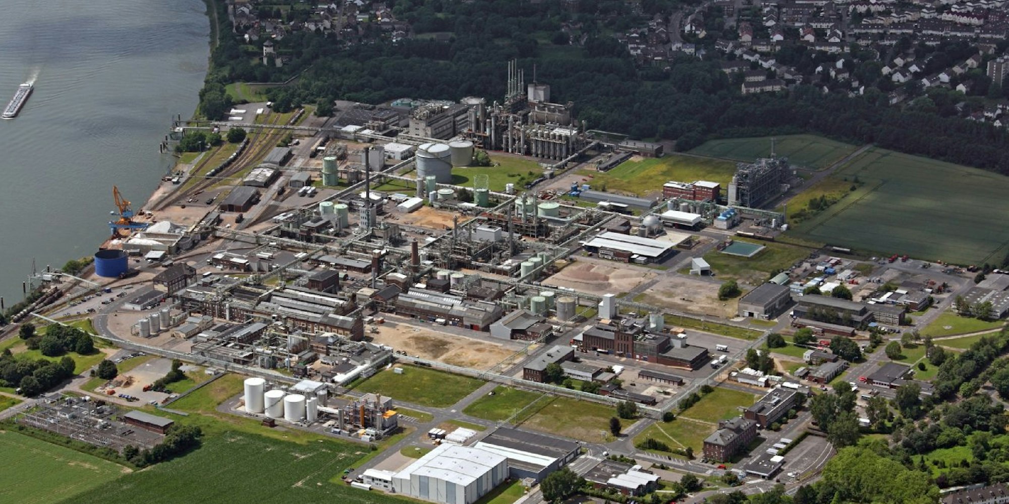 So sieht das Evonik-Gelände in heutiger Zeit aus. Links der Rhein, vorn rechts die typischen Giebel der alten Werkskolonie, Ranzel