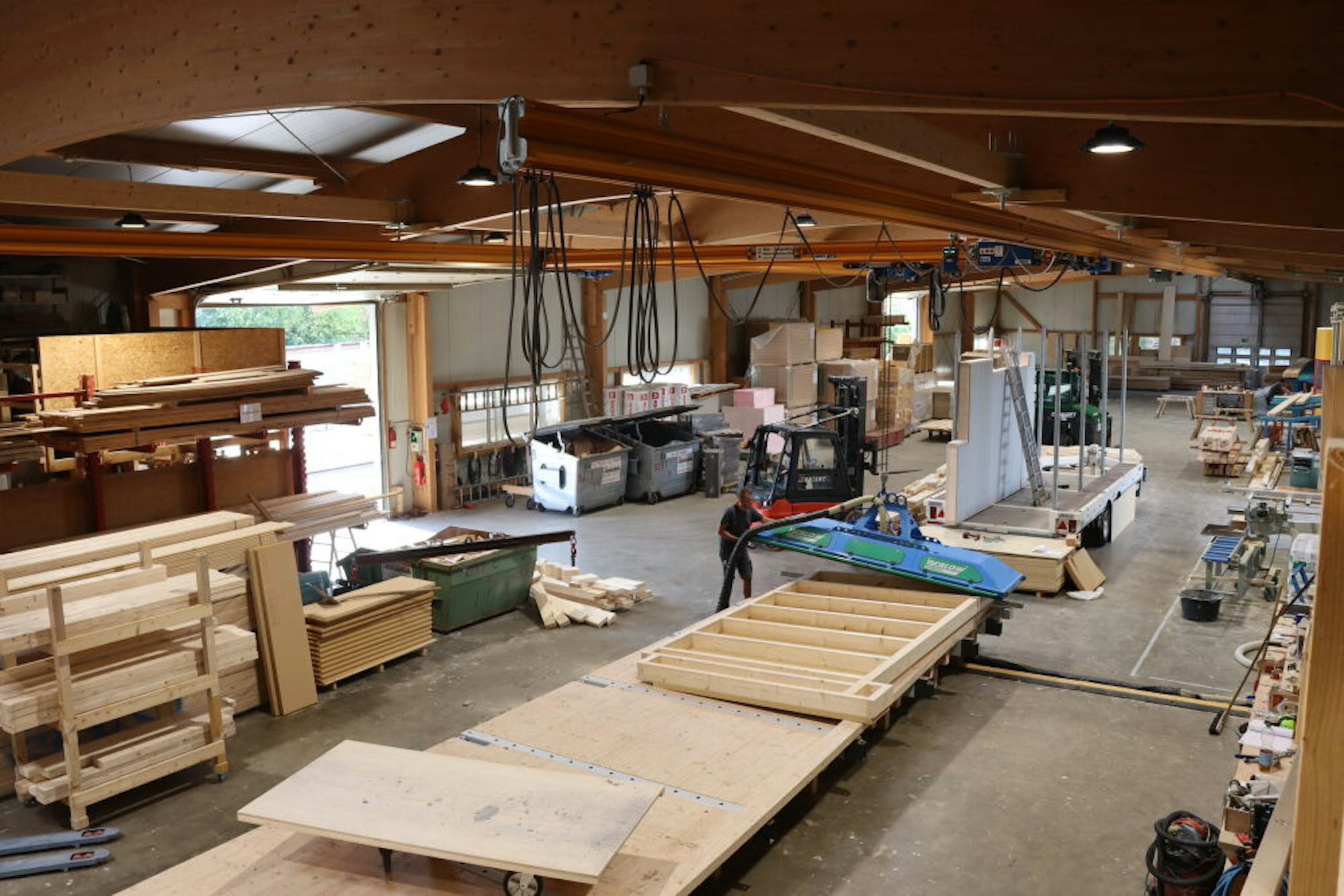 Bei der Vorelementierung der Holzbauteile: Ein Mitarbeiter bringt die Dämmung in die Wände ein.
