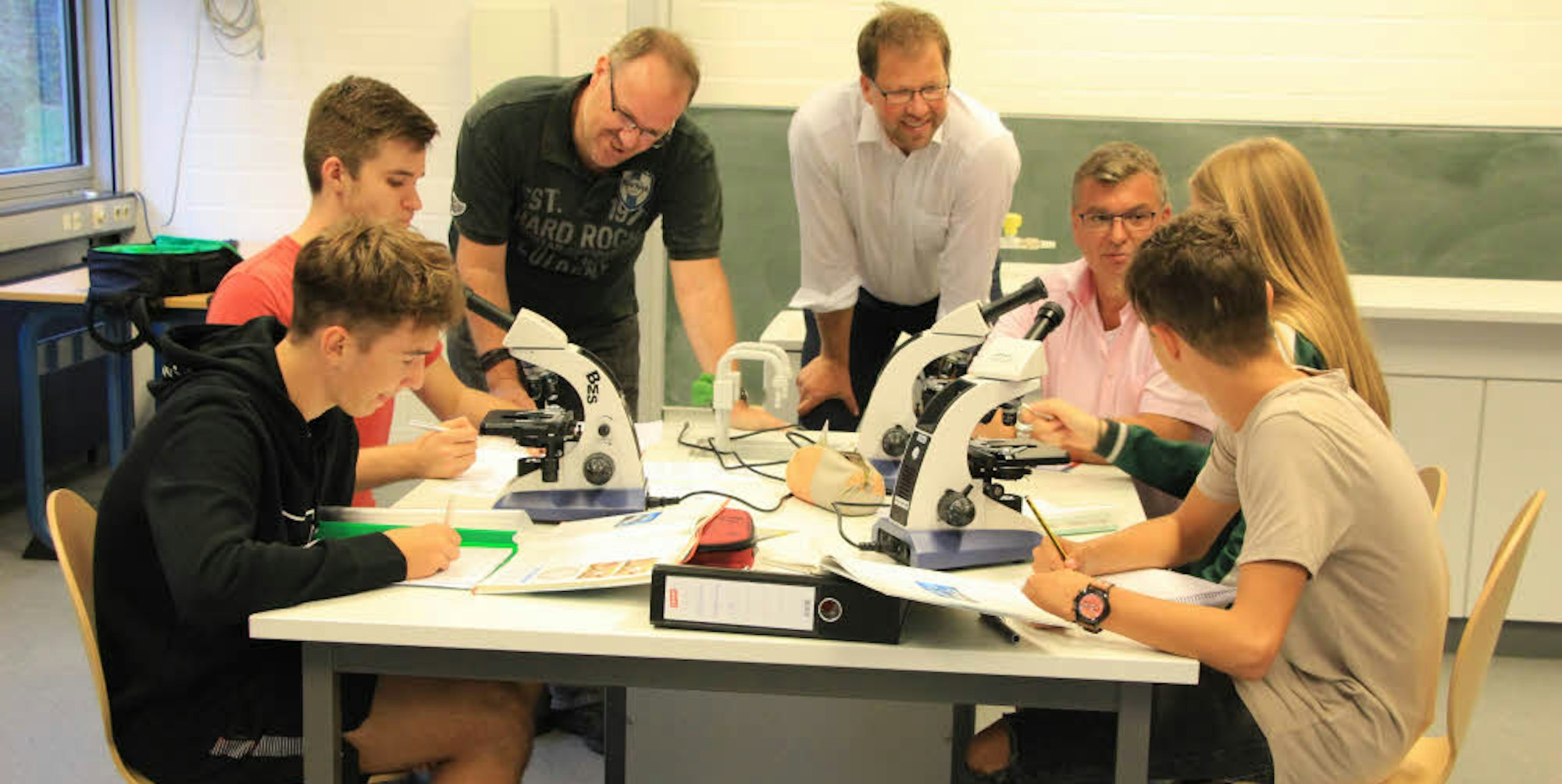 Fachlehrer Harald Zorn freut sich über die Möglichkeiten in den neuen Räumen. An den wie Inseln im Raum angeordneten Tischen kann besser in Gruppen gearbeitet werden. Strom, Wasser und auch andere Anschlüsse erleichtern das Experimentieren. „Ich empfinde auch die helle und freundlicher Atmosphäre im neuen Klassenraum sehr angenehm“, sagt Schülerin Merle, die zusammen mit ihren Klassenkameraden am Tisch mit elektronischen Mikroskopen Zellen untersucht.