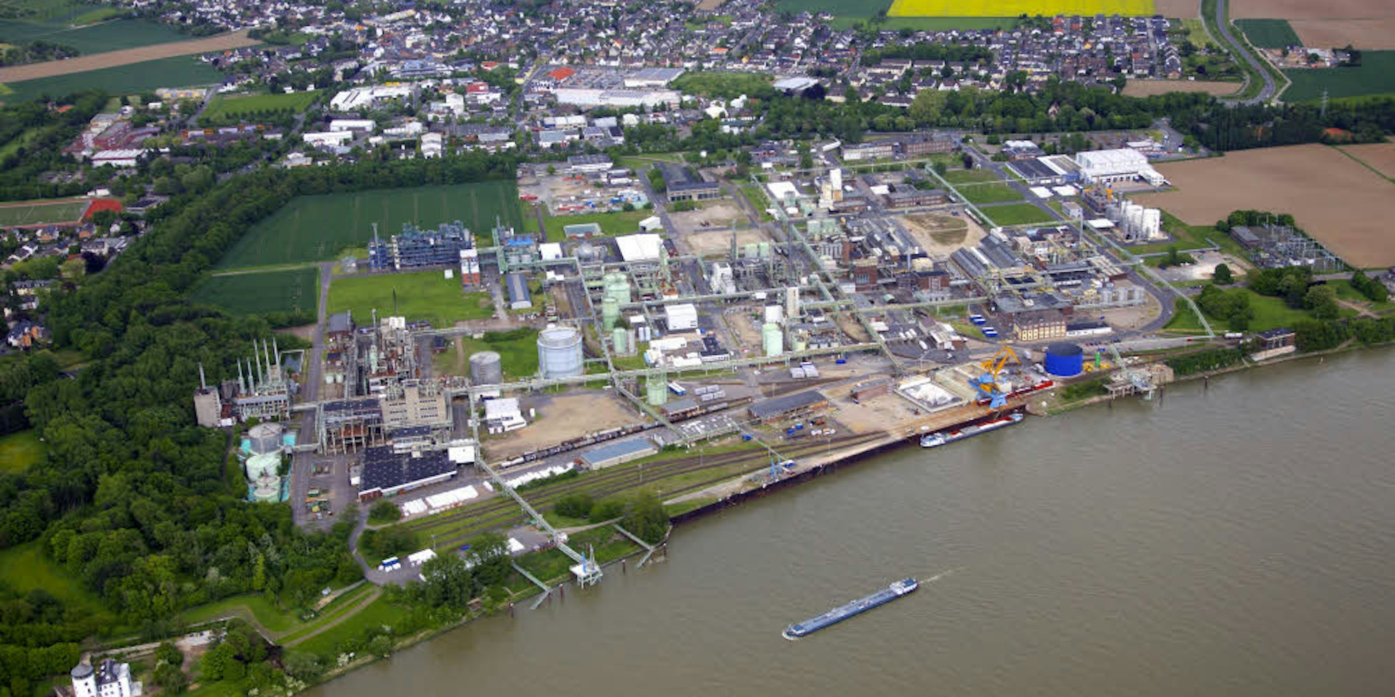 Das Evonik-Gelände aus der Luft: Unmittelbar am Rhein soll das neue Containerterminal entstehen, im nördlichen Teil des Areal (im Bild links) der erste Abschnitt des geplanten Logistikzentrums.