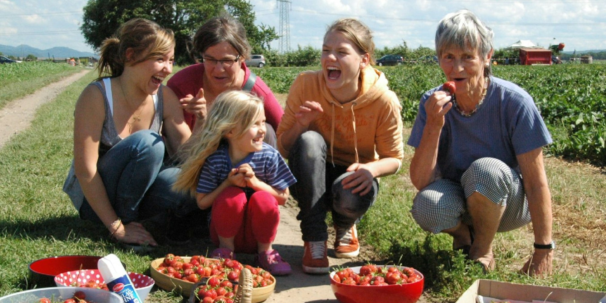 Niederkassel – "Eigentlich macht das Spaß", findet Jule (7), "nur hinterher ist man ein bisschen schlapp." Nach einer Dreiviertelstunde eifrigen Erdbeerpflückens legt Familie Möhn aus Köln eine Pause ein. Die fünf Frauen aus drei Generationen sind zufrieden mit ihrer Ausbeute: etwa fünf Kilo pralle, saftig-rote Früchte liegen in Körben und Schalen. Am längsten hält es Oma Lucie (77) im Feld aus. "Aber wie das wohl die Erntehelfer schaffen - den ganzen Tag in gebückter Arbeitshaltung?", sinniert Sabine Möhn (45).