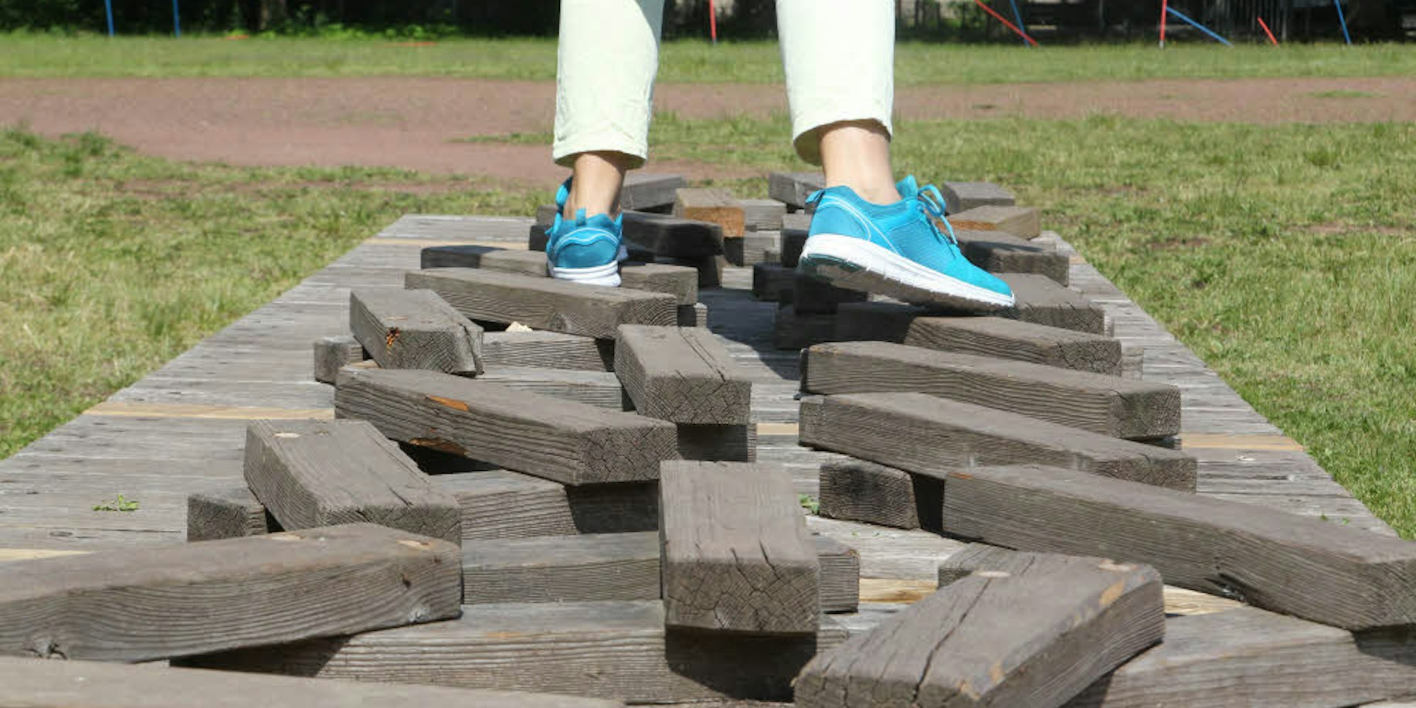 Mit festem Schuhwerk oder barfuß kann man balancieren, wippen und schwingen. Eine Herausforderung ist die Metallplatte, die an vier Ketten hängt. Gar nicht so einfach auch das Geviert aus Holz, das auf dicken Stahlfedern ruht und durch Körper nur auf und ab und hin und her bewegt wird. Kantige Streben bieten noch einigermaßen Halt, schräge, runde Flächen fordern den Gleichgewichtssinn mehr, und der Gang auf den abgerundeten in Schlangengestalt wird schnell zur Rutschpartie. Die Landung im Sand ist aber weich.