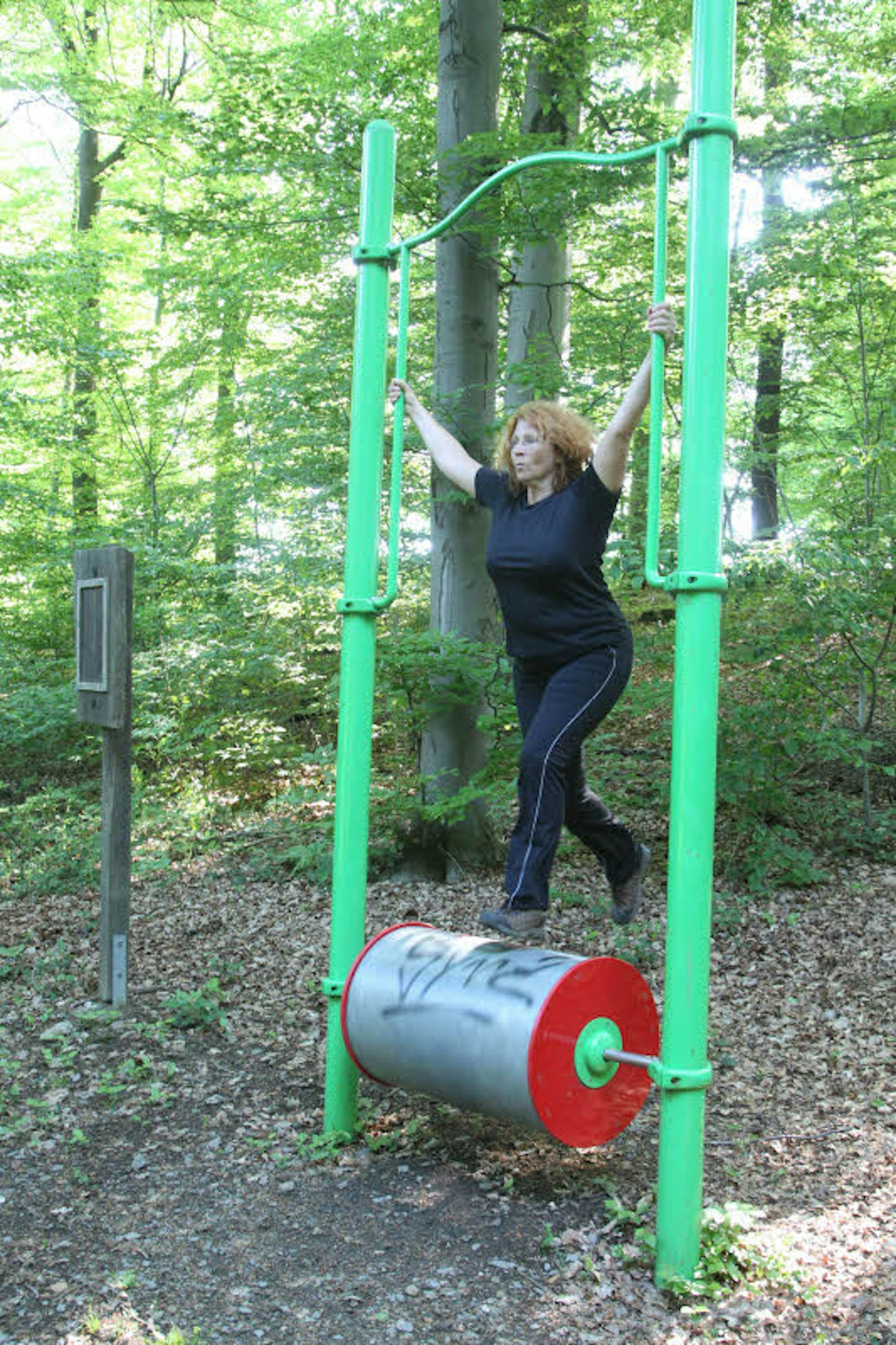 Nun der Beinheber. Halb so schlimm: Einsteiger dürfen die Oberschenkel abwechselnd heben. Cracks werden mehr gefordert. Der „Mehrgenerationen-Parcours“, so heißt es auf einer weiteren Tafel mit einem Bild eines älteren Menschen, soll allen Spaß machen. Und die Hemmschwelle senken. Was Senioren schaffen können, das kriegt auch die Sofakartoffel um die 50 hin.