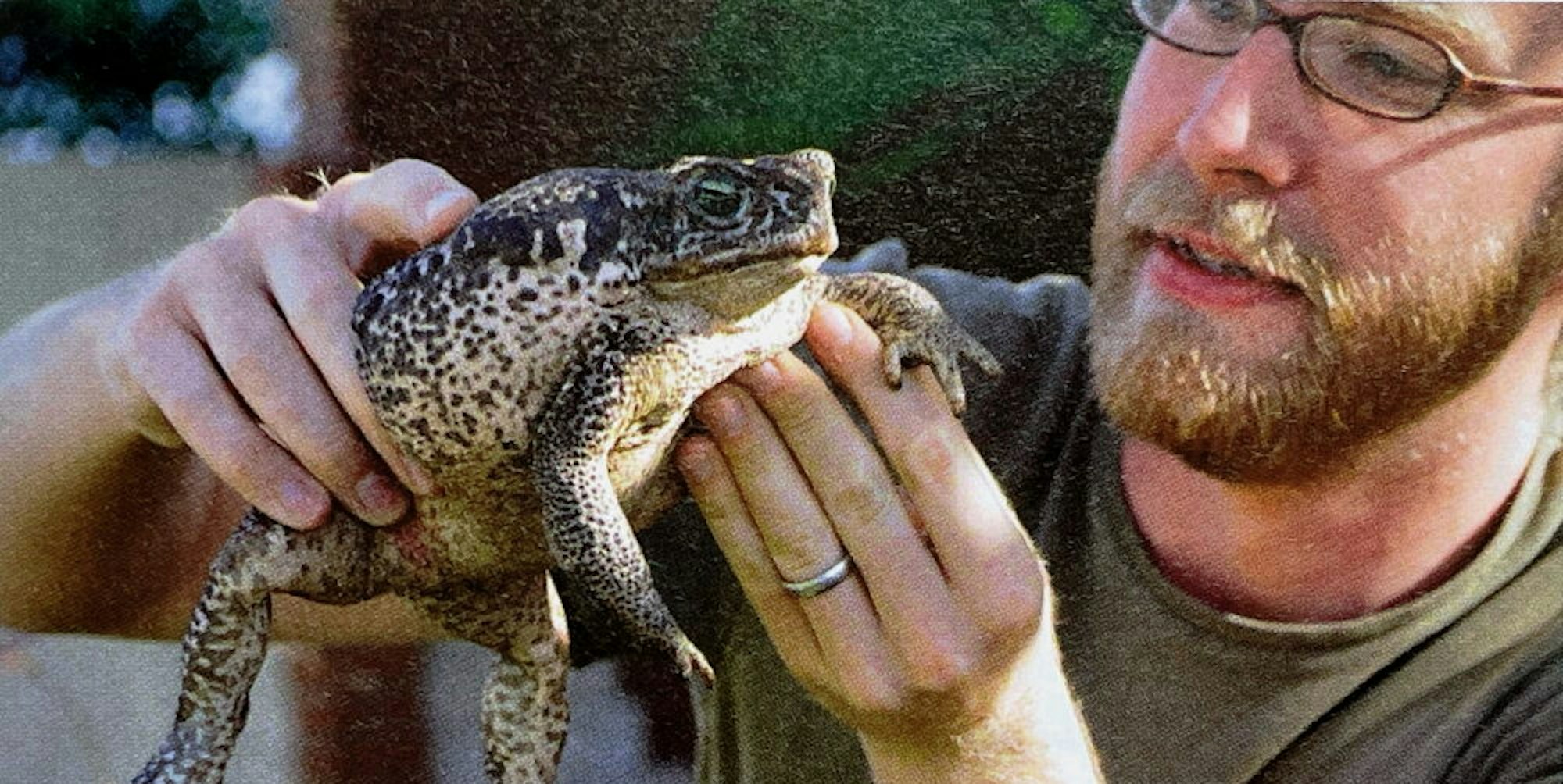 Aga-Kröten sollte man nicht anfassen, da sie extrem giftig sind. Falls man sie berührt, sollte man sich danach tüchtig die Hände waschen. Das Foto zeigt den Autor mit einer Kröte in Paraguay.