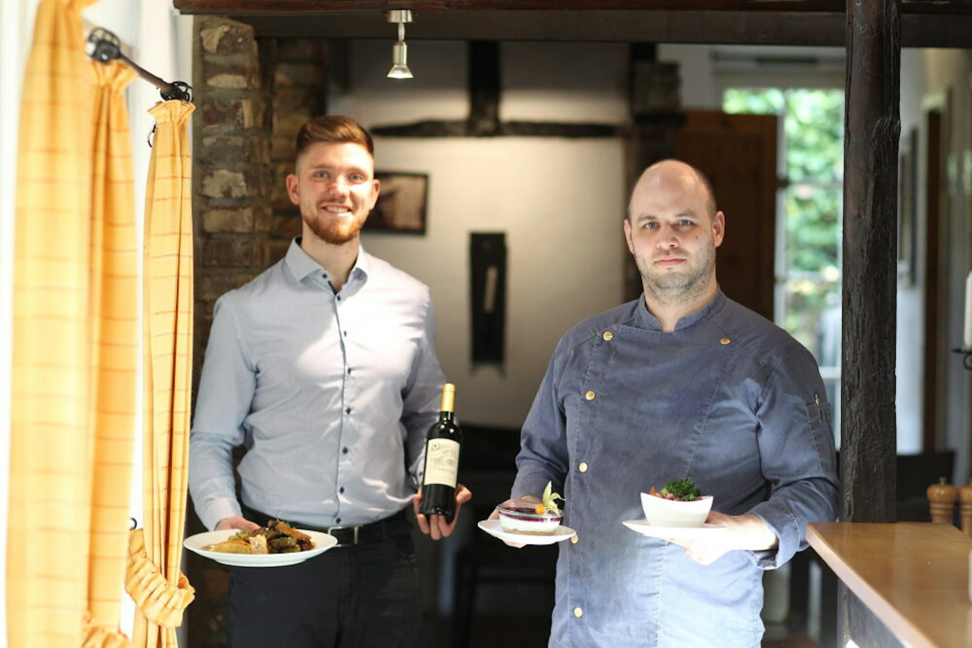 Inhaber Felix Heyne (links) und sein Küchenchef Lars Siebertz präsentieren in den Räumen das Ostergericht des Restaurants Bierthe. Vor zwei Jahren hat Heyne das Traditionshaus übernommen.