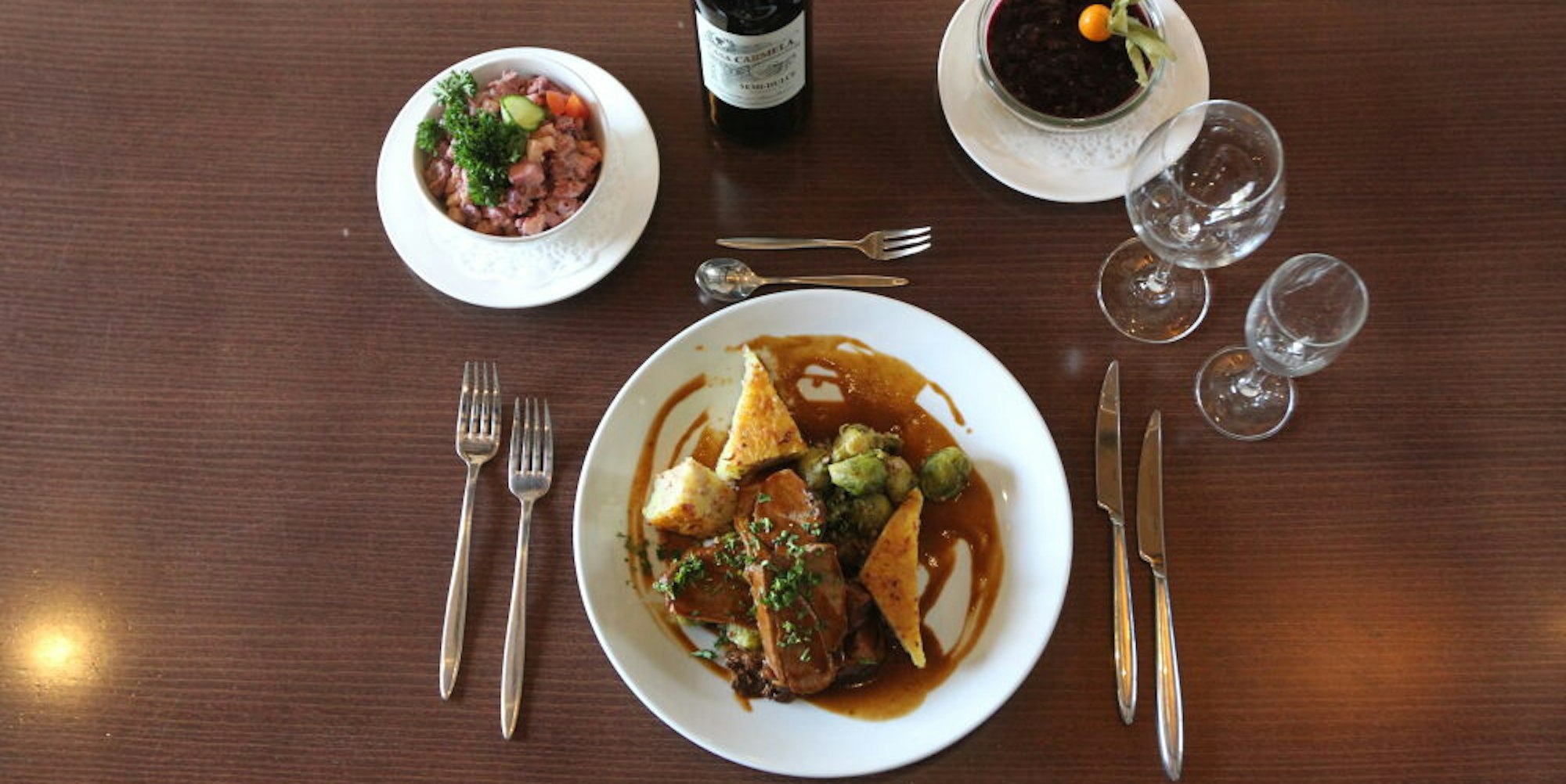 So würde das Menü am Tisch im Restaurant Bierthe aussehen: Heringssalat, geschmorte Lammkeule mit Döppekuchen und Rosenkohlgemüse und Quark-Mousse mit Waldfruchtkompott.