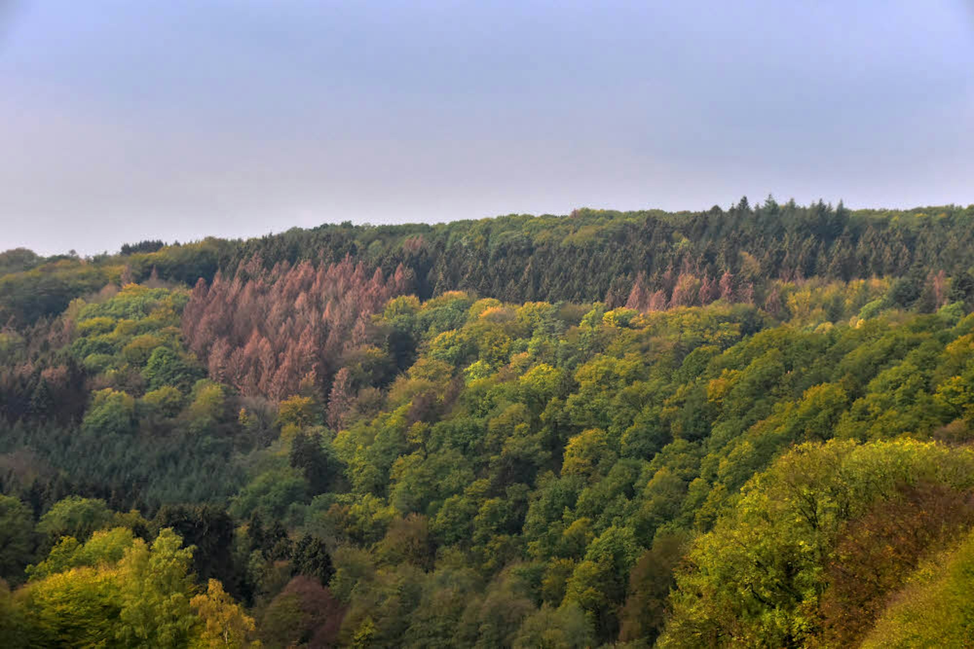 Schon beim ersten Blick auf den Herbstwald fallen die braunen Fichten auf, die der Borkenkäfer abgetötet hat. Sie müssen jetzt schnell verarbeitet werden.