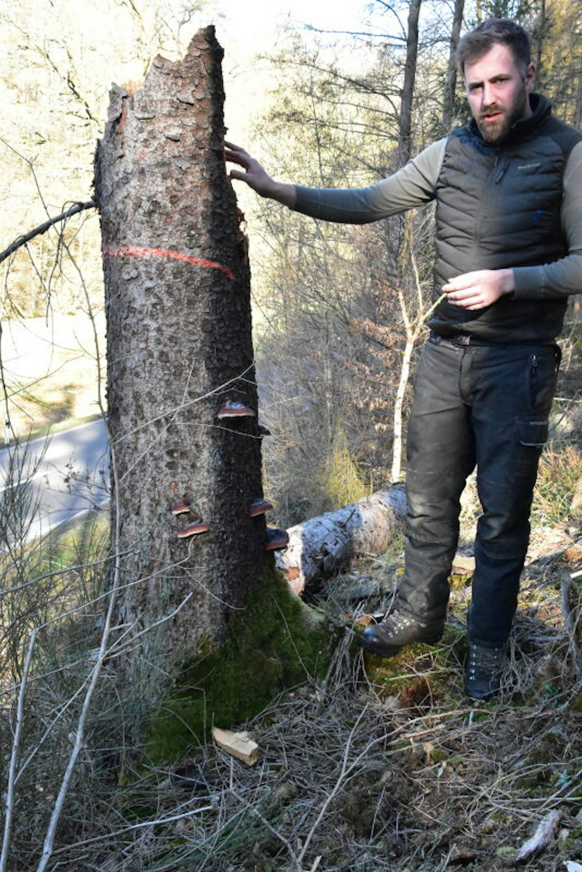 Die Gefahr erläuterte Porten anhand einer Fichte, die in zweieinhalb Metern Höhe abgebrochen war. Die Trockenheit schwäche die Fichten. Den Pilzen, die sich am Stamm ansiedeln, hätten sie nichts mehr entgegenzusetzen. Das Holz werde spröde und breche bei Wind ab. Der betroffene Baum war immerhin nicht auf die Straße, sondern seitlich gestürzt, so dass er zwischen anderen Bäumen liegen blieb.