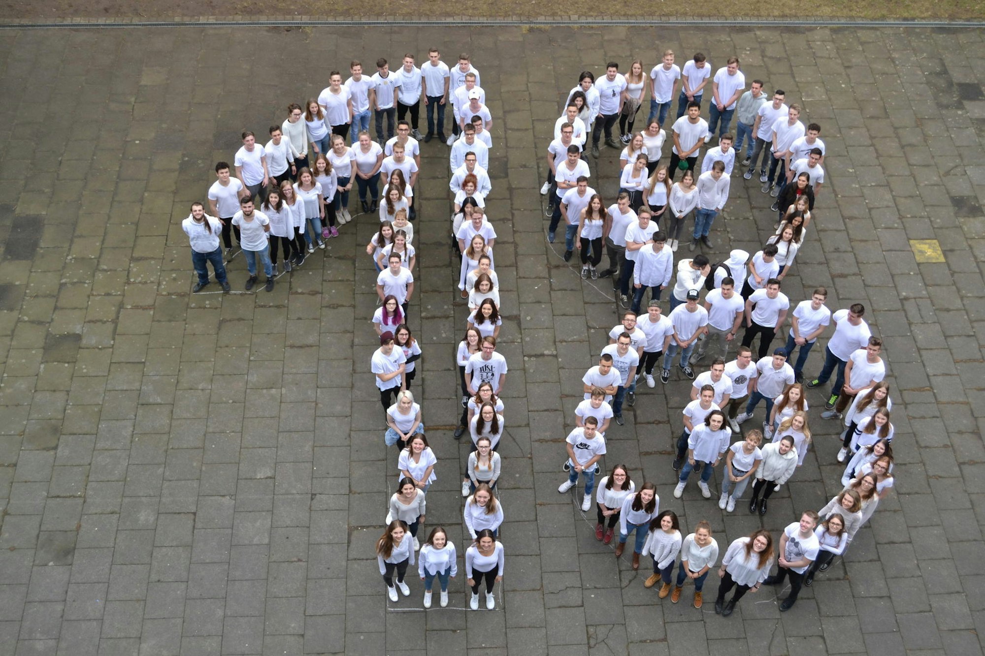 Zu einer großen 18 formierten sich die Abiturientinnen und Abiturienten des Siegburger Anno-Gymnasiums.