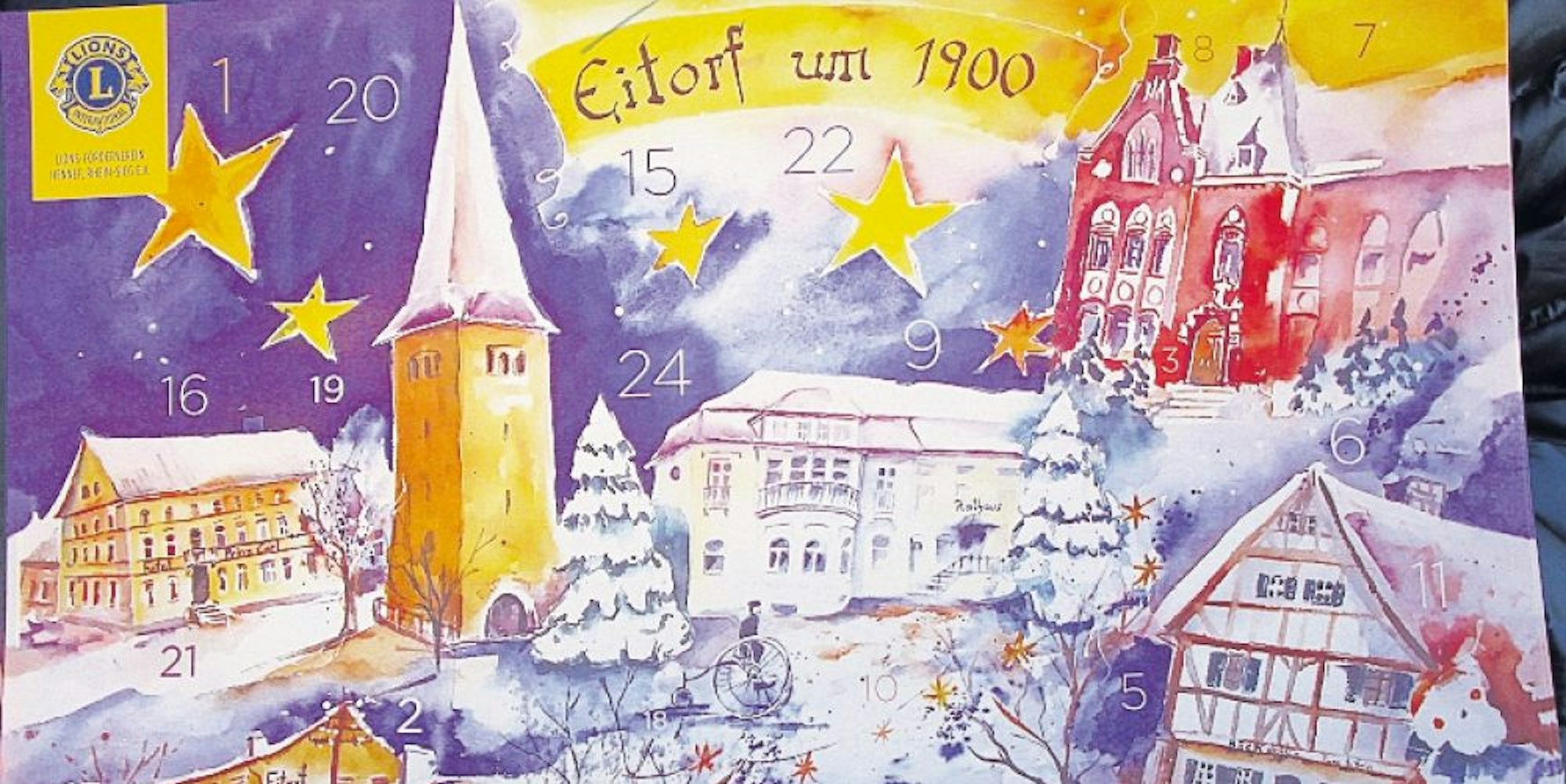Schloss Allner, der Bahnhof, Drei-Giebel-Haus, Quadenhof, die Chronos-Villen und Lindenhof haben zusammen 24 Türen. Das trifft zumindest auf dem Hennefer Adventskalender des Lions Clubs Hennef Rhein-Sieg zu. Wie im Vorjahr hat die Windecker Aquarellmalerin Sabine Hilscher das Bild für den mittlerweile sechsten Lions-Kalender geliefert und diesmal dafür sogar in der Stadtgeschichte recherchiert. „Hennef damals“ ist das Werk überschrieben, das im Original für 400 Euro erworben werden kann.
