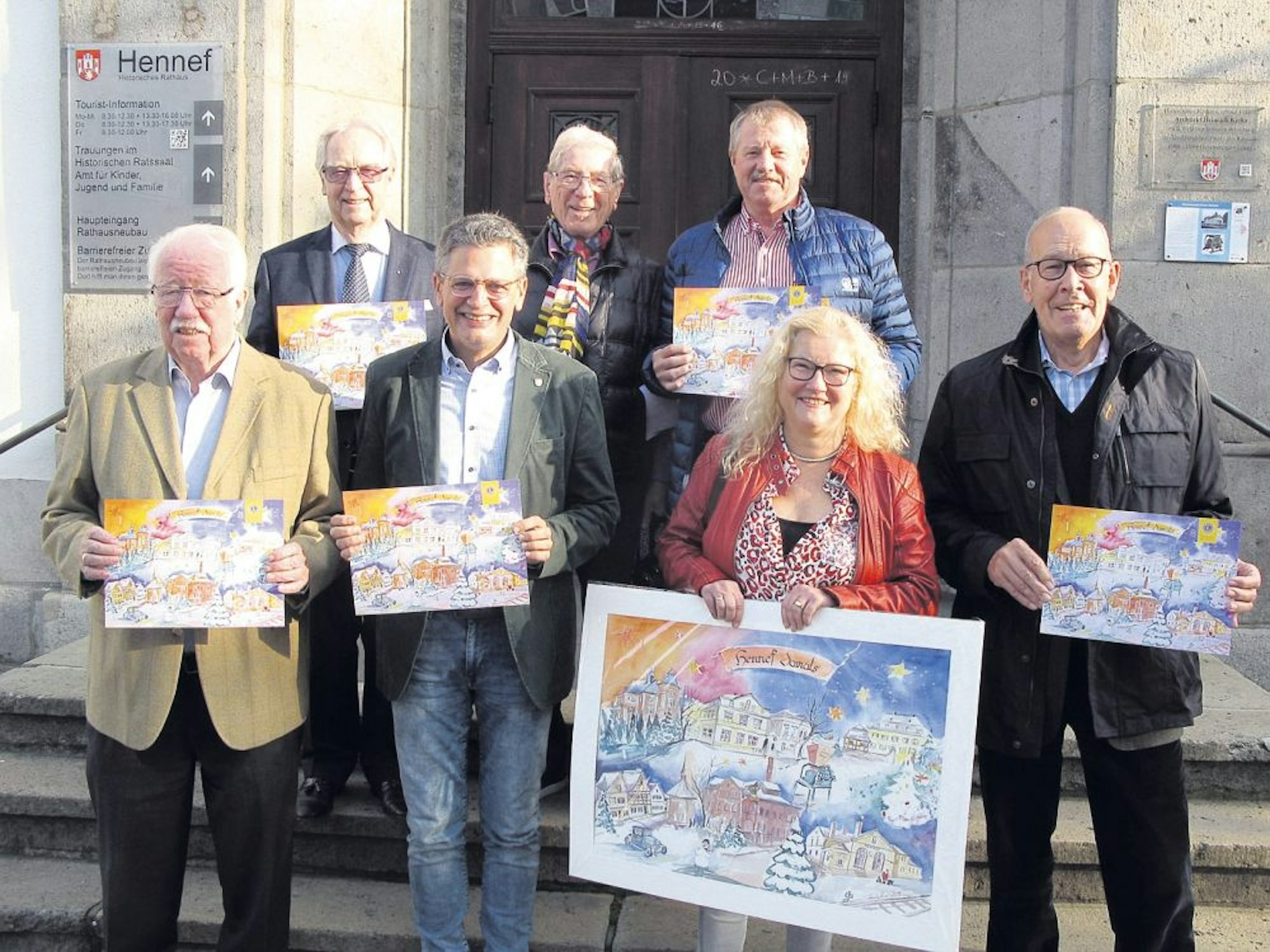 Mit der Künstlerin Sabine Hilscher und Bürgermeister Klaus Pipke (vorn Mitte) präsentieren Josef Fuchs, Karl-Heinz Schyns, Hans-Jürgen Zimmermann, Walter Keuenhof und Michael Jaeger (von links) vom Lions Club den Hennefer Adventskalender.