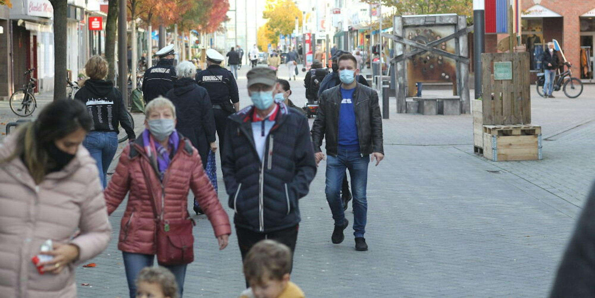 Mitarbeiter des Ordnungsamtes weisen Passanten gegebenenfalls auf die Maskenpflicht hin und verschenken sogar Masken.