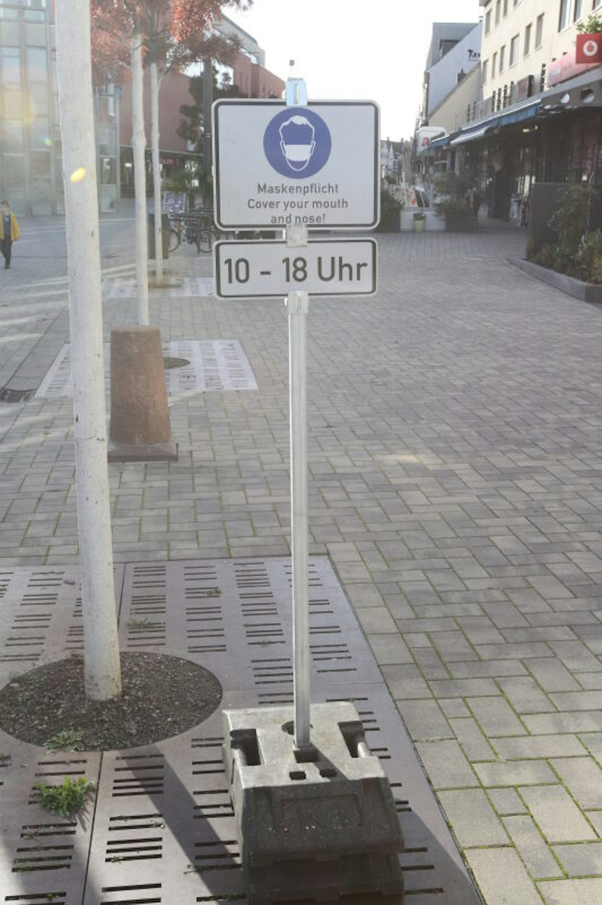 Ein Schild weist auf die Maskenpflicht in der Fußgängerzone von 10 bis 18 Uhr hin.