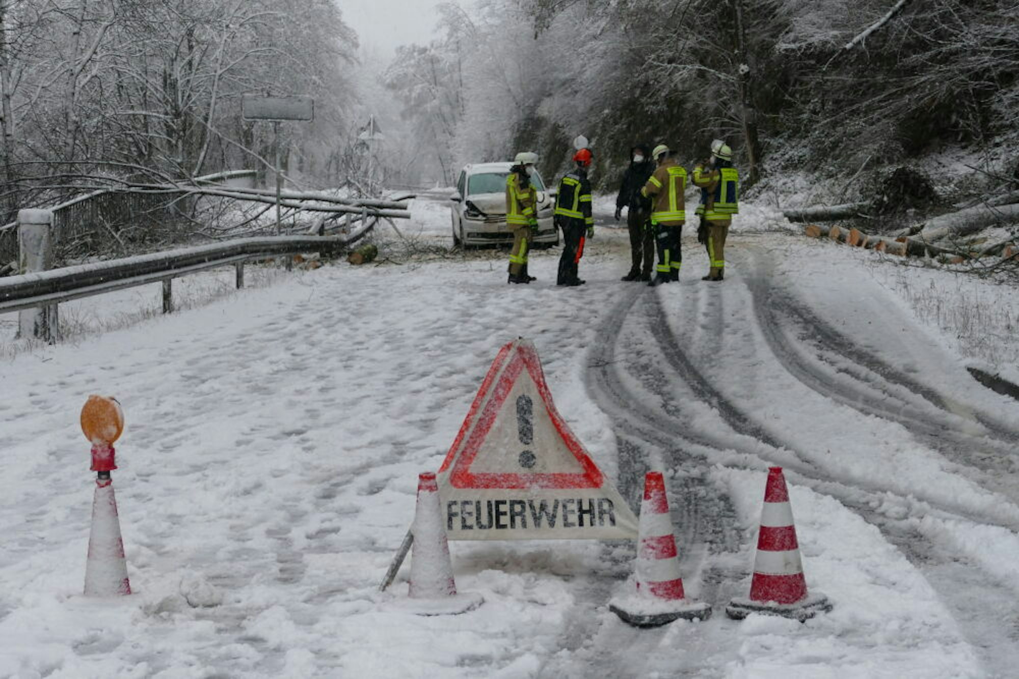 Noch länger dauerte die Sperrung der L333 zwischen Hennef und Eitorf. Auch hier war es der Feuerwehr zu heikel, die Fahrbahn von den Bäumen zu befreien, weil jederzeit weitere Äste hätten herabfallen können.