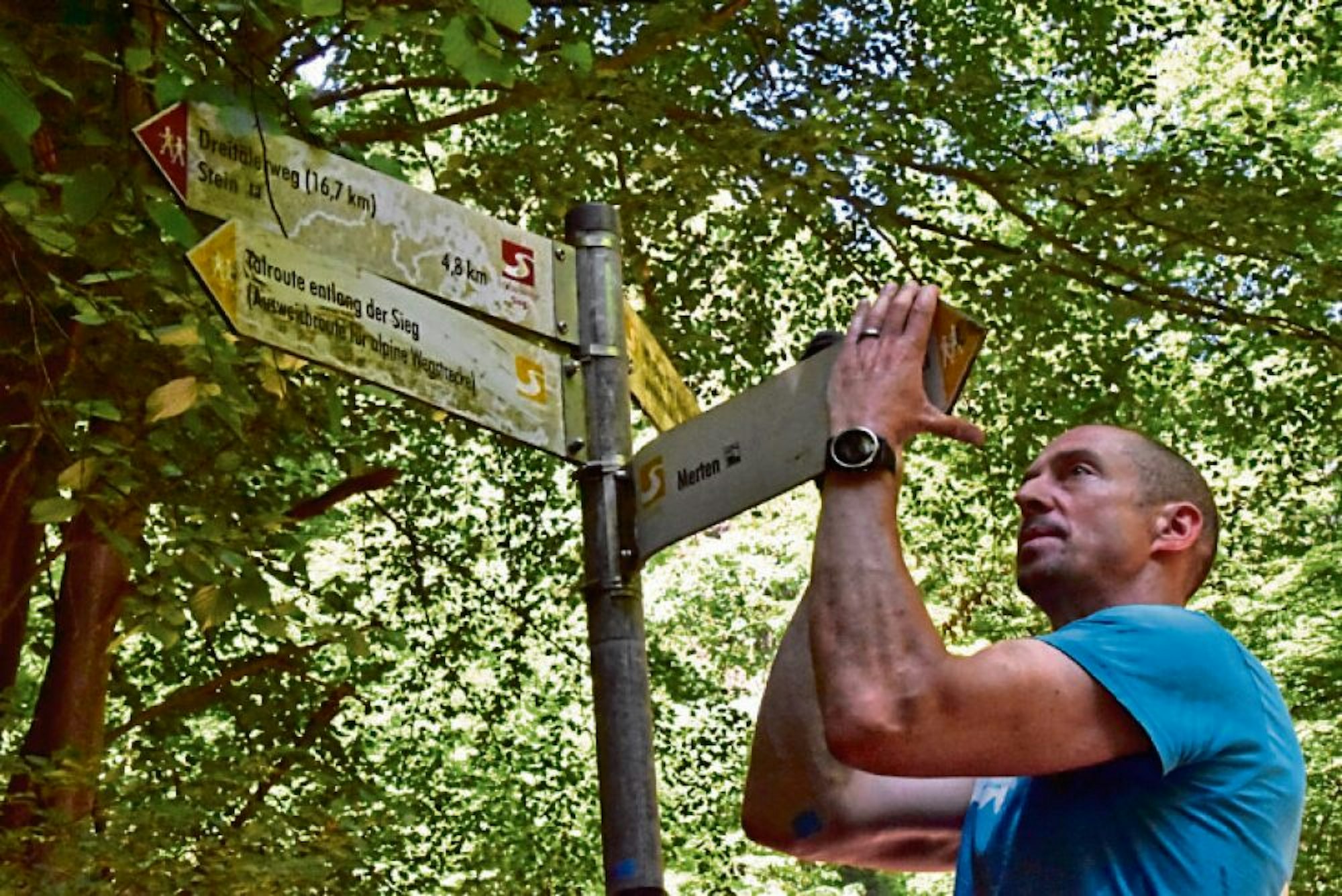 „Der Wald heizt sich auf. Es wird auch bei uns trockener.“ Während Knopp die Schilder wartet, kommt er mit Kim Wittfeld ins Gespräch. „Eigentlich wollte ich zum Surfen nach Südafrika, das war der geplante Sommerurlaub“, berichtet der Kölner. Stattdessen ist er mit seinem Onewheel auf dem Natursteig unterwegs. Beim Auf und Ab mit dem akkubetriebenen Einrad über die Pfade und Wege fühlt sich der Betreiber einer Agentur für Digitalprojekte richtig wohl. „Ich habe sogar schon mal mit dem Gedanken gespielt, hierher zu ziehen“, verrät er, holt sich beim Experten noch Tipps und ist dann wieder verschwunden.