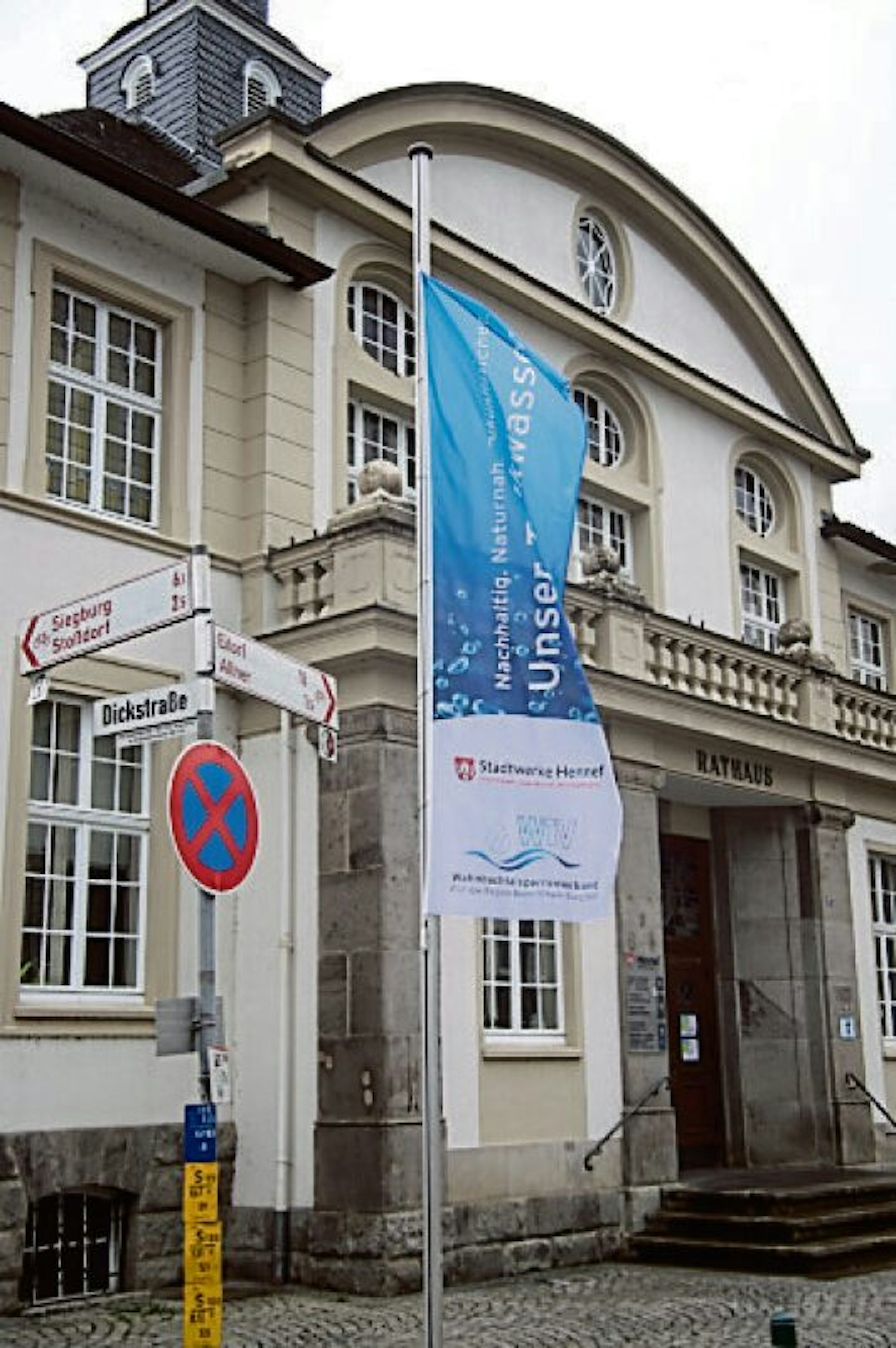 Zum Weltwassertag hat die Stadt Hennef eine Fahne vor dem Rathaus gehisst.