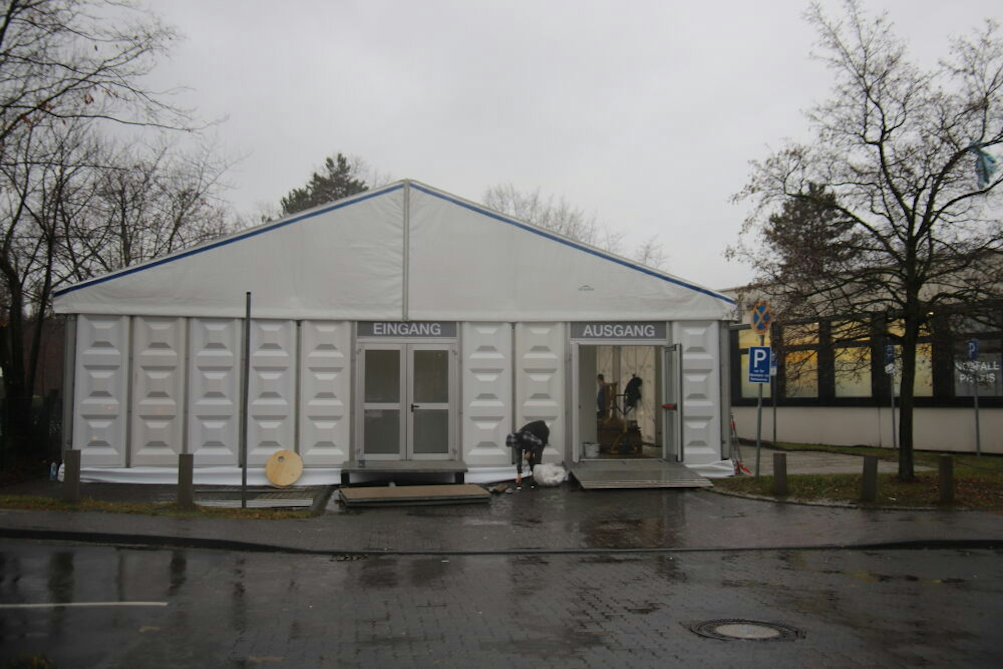 An der Einfahrt zur Asklepios Kinderklinik ist eine Leichtbauhalle für die Registrierung und Aufklärung aufgebaut worden.
