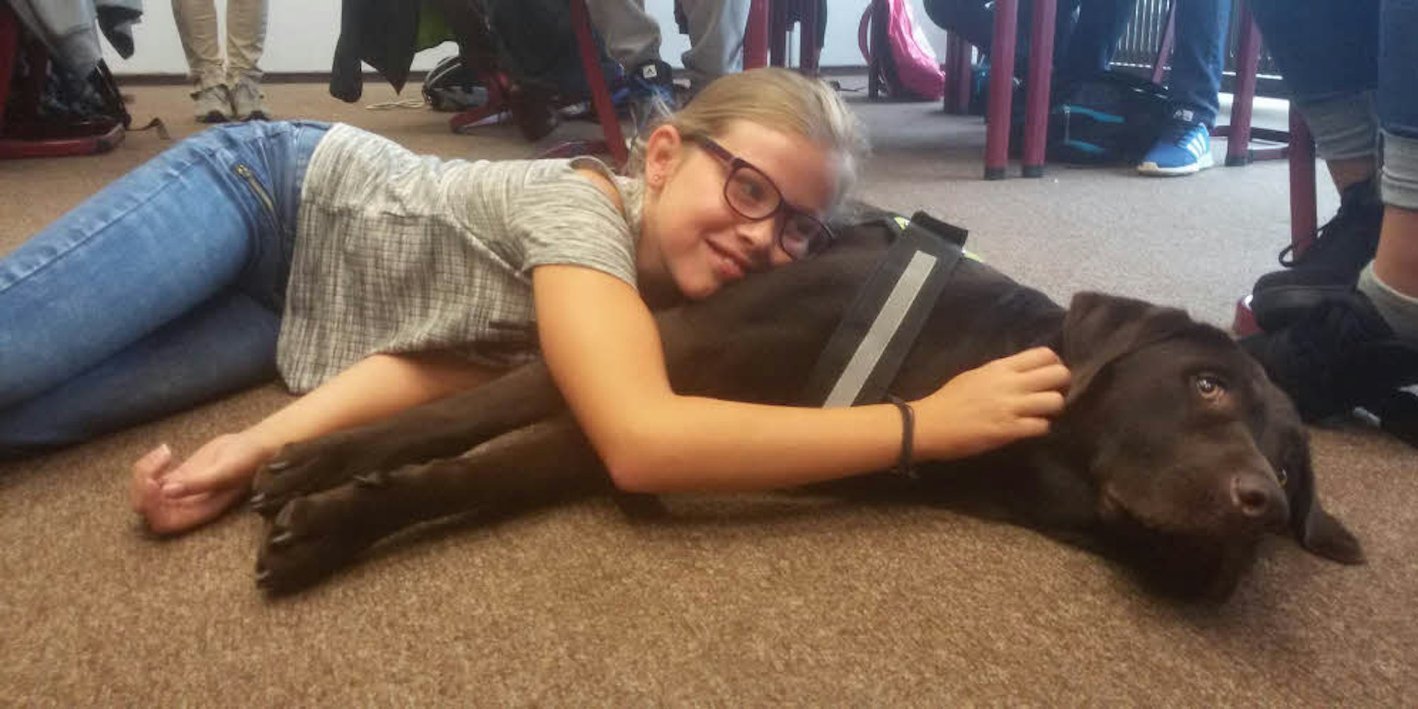 Celine Schanski (11) kuschelt mit Schulhund Paul.
