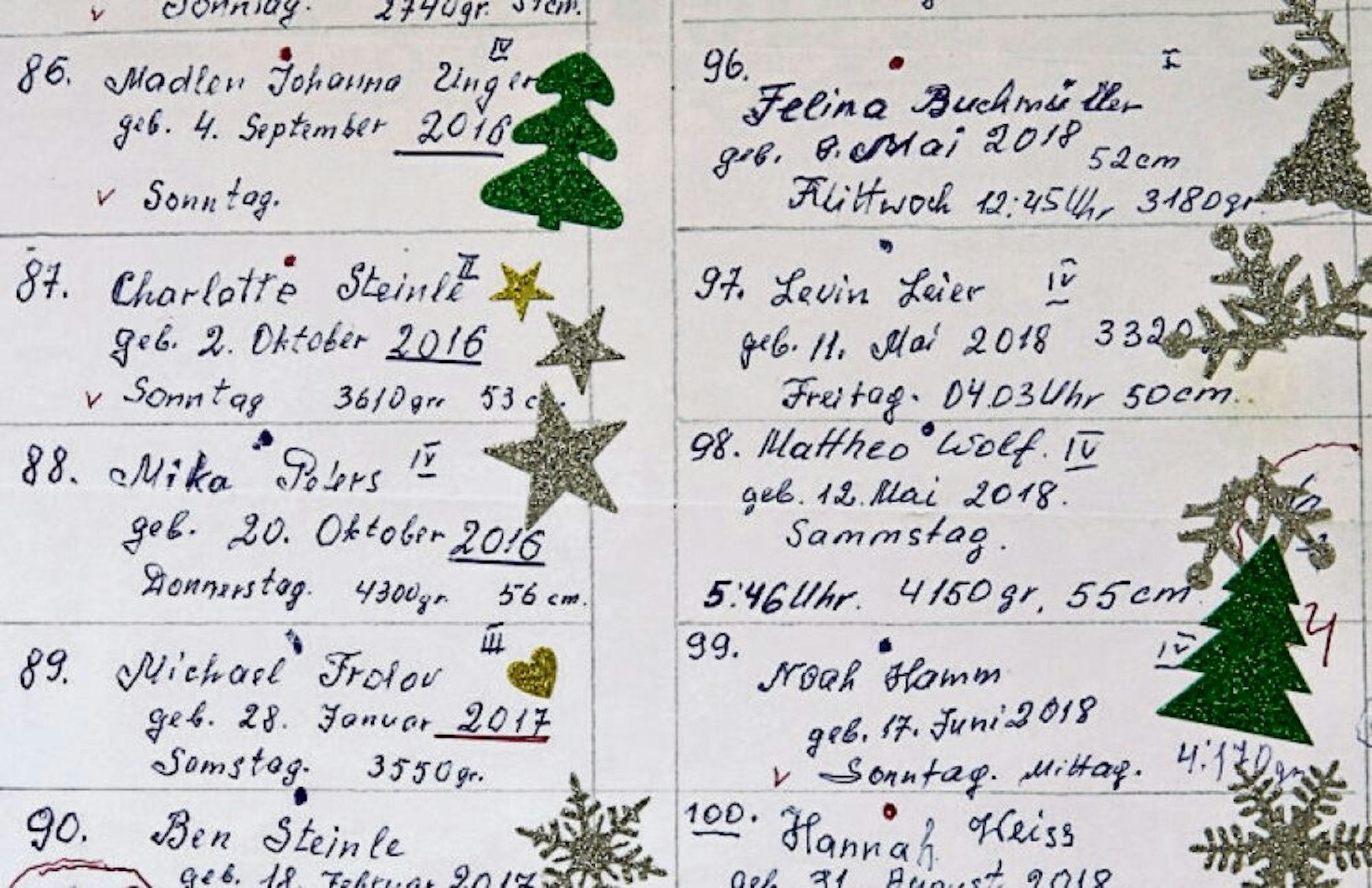 Die Frage, ob da jemand alle Namen der Nachkommen kennt, beantwortet Tochter Nelli Steinle: „Die Mama, sie weiß außerdem alle Geburtstage.“ Für die 92-Jährige scheint das nichts Außergewöhnliches zu sein. „Ein bisschen lässt es jetzt nach, mein Computer wird langsam leer“, räumt sie lächelnd ein und deutet auf ihre Stirn. Quasi als Datensicherung könnte irgendwann das Heft dienen, in dem sie die Daten der Nachkommen akribisch registriert.