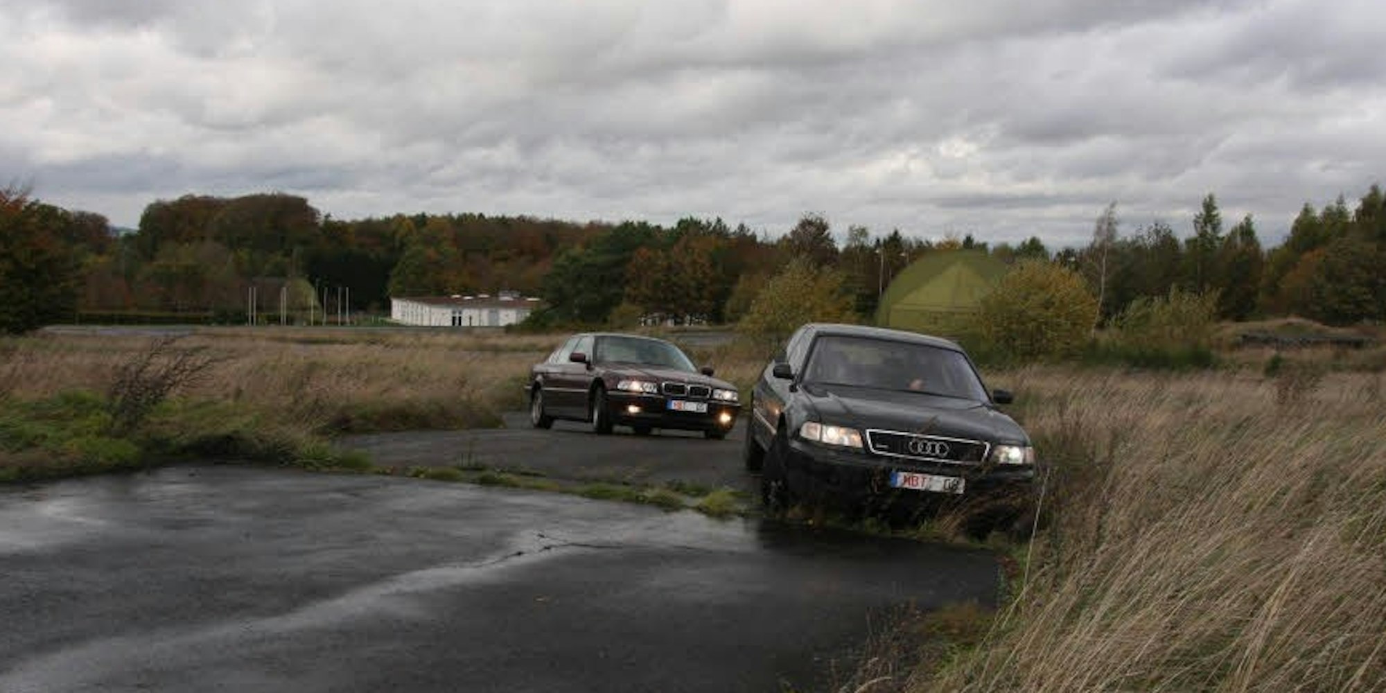In der Halle hinter der Werkstatt liegen etliche Sätze Reifen. Die sind bei den vielen Schleuder- und Driftaktionen in besonderem Maße Verschleißteile. Zum Fuhrpark gehören auch zwei alte BMW, die für Kollisions- und Rammübungen benutzt werden, „Rums“ und „Bums“ ist auf den Seiten schlicht aufgesprüht. Und auch hier geht es nicht um plattes Draufhalten, sondern um die Nutzung von Fahrdynamik, schlichter Physik. Leichte Anstöße, das beweist die Probe aufs Exempel, bringt einen möglichen Gegner ins unkontrollierte Schleudern. Extrem schnell und dicht fährt der Trainer an das Fluchtfahrzeug heran, Präzision in Perfektion.