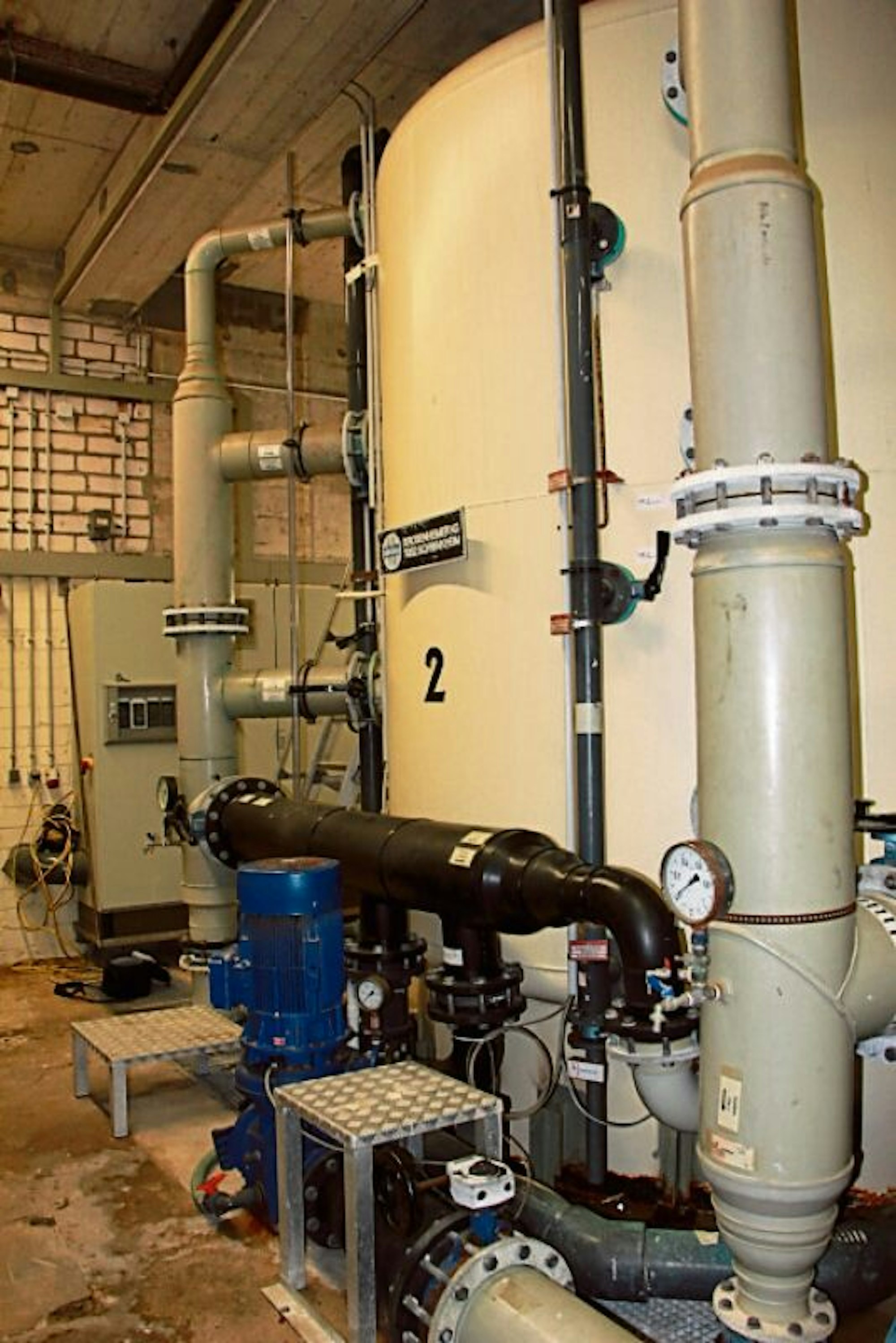 Gierse hat den Verschluss zu einem der Filterbehälter geöffnet. Er greift hinein, der trockene Sand rieselt durch seine Finger. Während des Badebetriebes steht der Behälter unter dem Druck von zwei Bar. So wird das Wasser durch den Sand gepresset und damit gereinigt. „Vorher werden größere Teile wie Haare oder Pflaster durch einen vorgelagerten Filter herausgesiebt“, erklärt Gierse. Im Sand blieben später Kleinstteile wie Hautschuppen hängen.