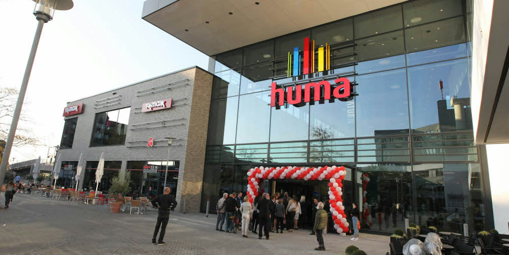 Im ersten Teil des Huma-Einkaufszentrums befinden sich rund 30 Geschäfte. Real und Saturn blieben nach dem Abriss des Altbaus als wichtige Ankermieter. (hin)