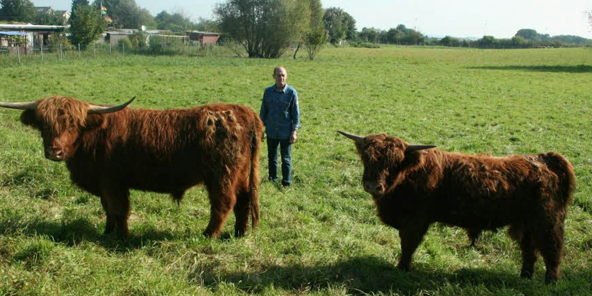 Oskar Schmoll ist stellvertretender Vereinsvorsitzender. Er hat zusammen mit Egon Herrmann gleich neben der Anlage eine Weide gepachtet. Dort grasen gemütlich schottische Hochlandrinder. Insgesamt neun Tiere haben die beiden. So kann Oskar Schmoll problemlos von seiner Laube aus in wenigen Minuten zu seinem Vieh auf fremdem Terrain gehen – ohne gegen die Regeln der Kleingärtner zu verstoßen, die Viehhaltung in der Anlage untersagen. Und der Mist der Rinder ist bei seinen Nachbarn in der Anlage begehrt als Dünger. „Blaukorn oder anderes chemisches Zeug brauchen wir hier nicht“, erklärt Oskar Schmoll zufrieden. „Die Rinder liefern genug Dünger für alle“. Seit fünf Jahren wird die Zucht betrieben.