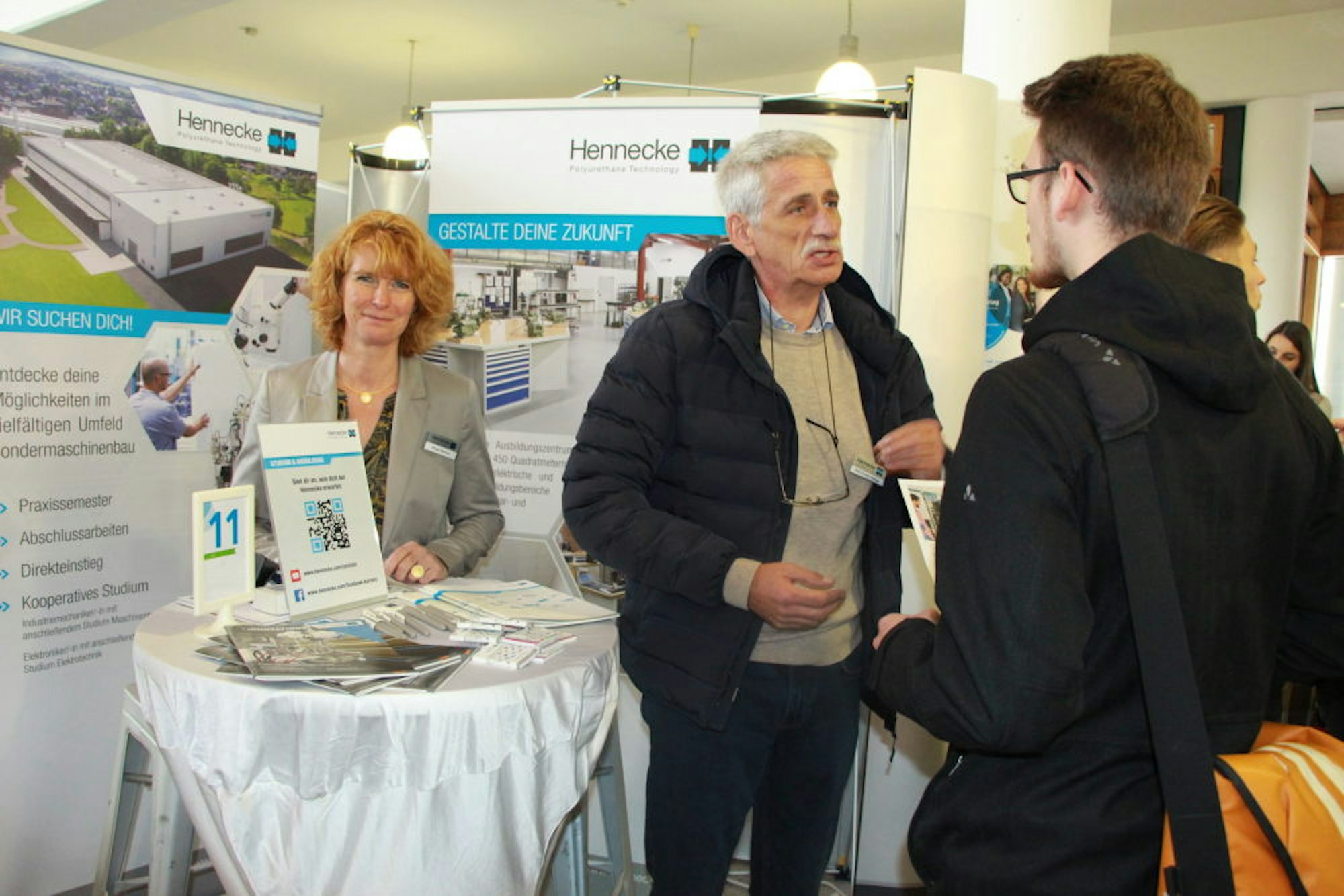 Heinz-Dieter Hensge (l.), Ausbildungsleiter bei Hennecke, im Gespräch mit einem Studenten über Perspektiven im Unternehmen.