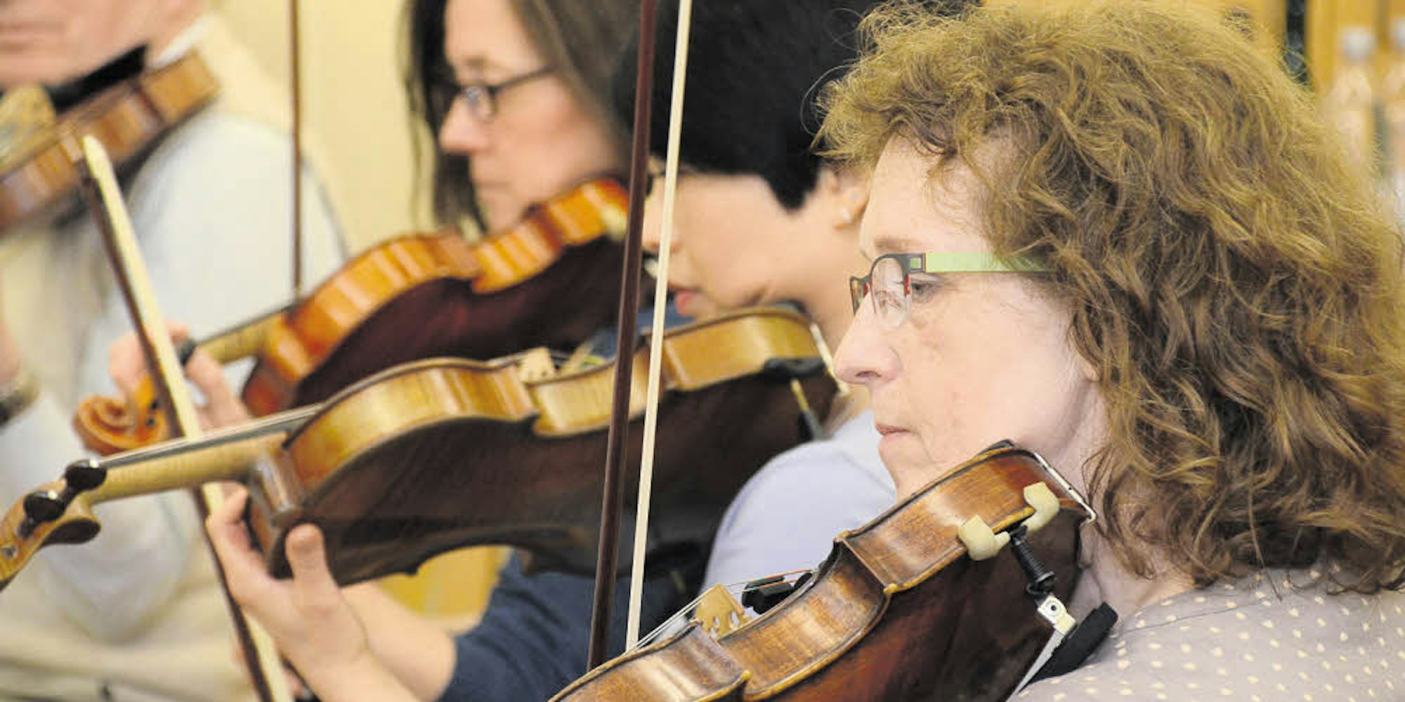 „Es gibt auch Berufstätige“ raunt Susanne Barning dem Berichterstatter zu, als sie leicht verspätet ihre Geige aus dem Koffer nimmt, den Bogen spannt und das Schulterkissen montiert. „Am Wochenende“ kommt die Logopädin aus Beuel zum Üben. Und das reicht dann? „Ich bemühe mich.“